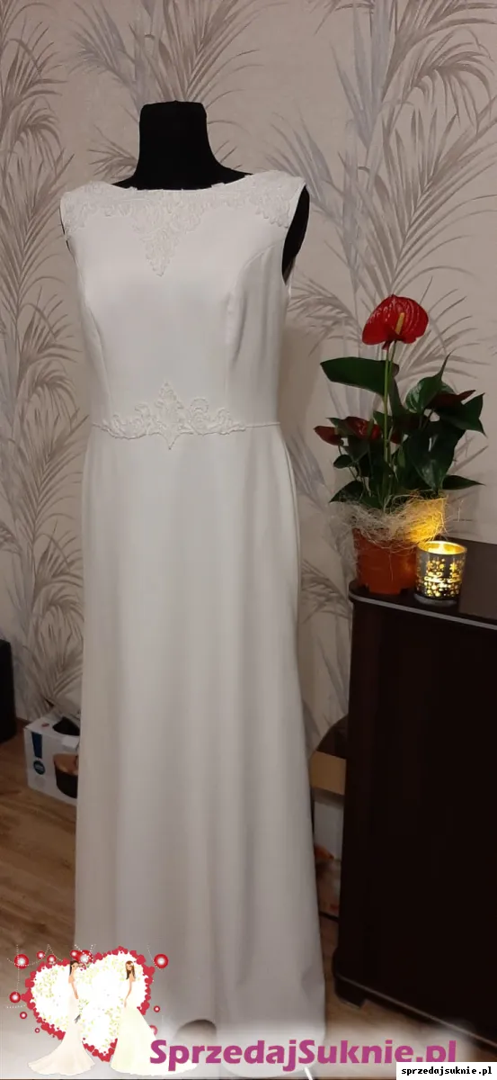 Z tyłu na plecach oraz z przodu na dekolcie i w pasie suknia ma delikatne zdobienia