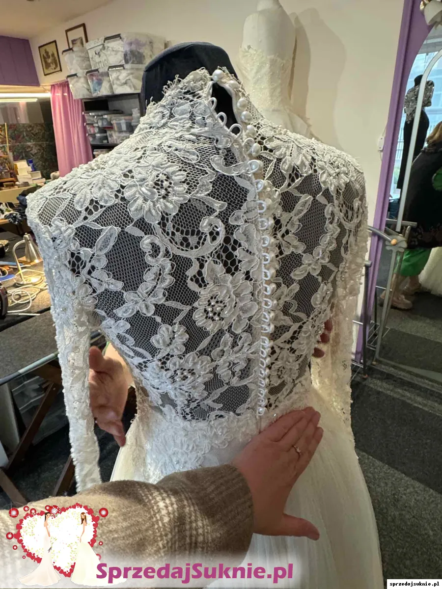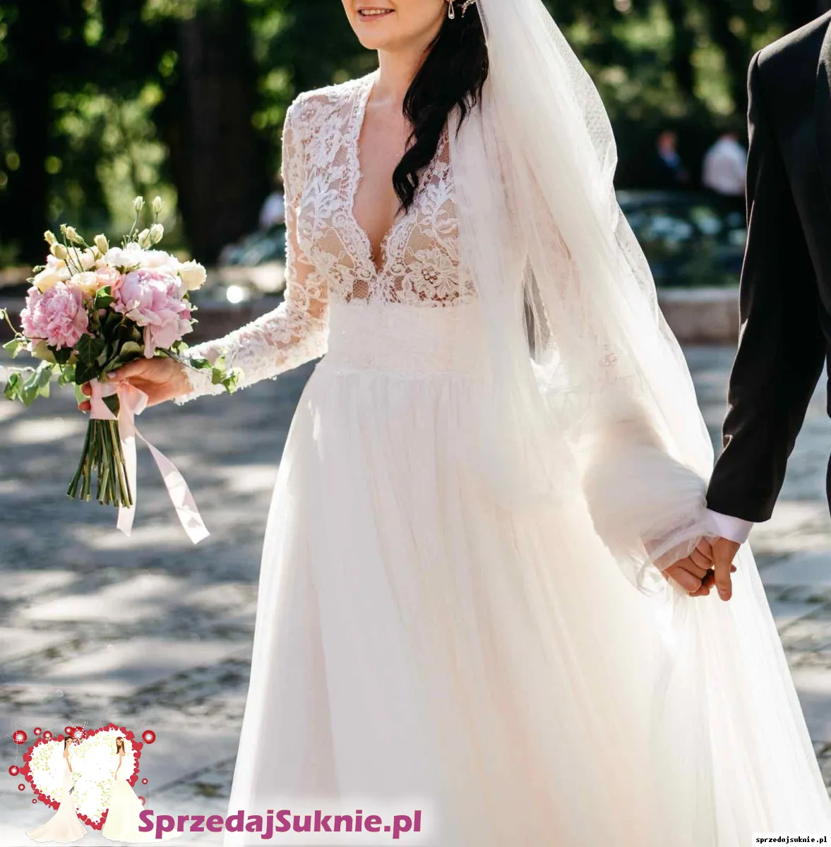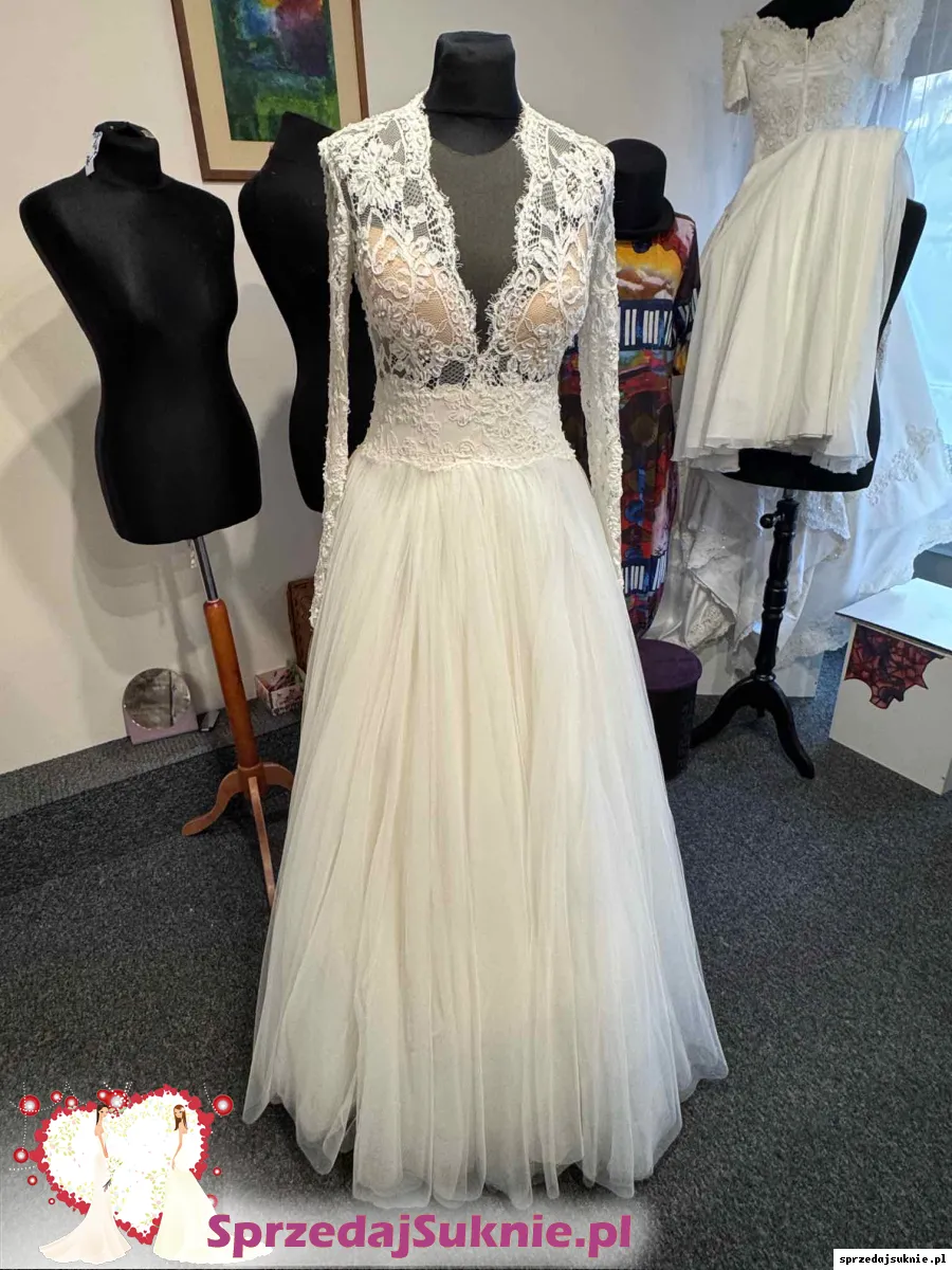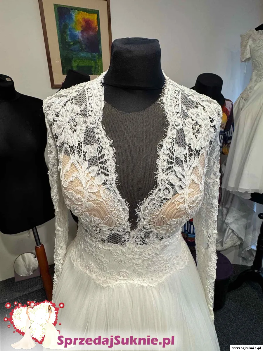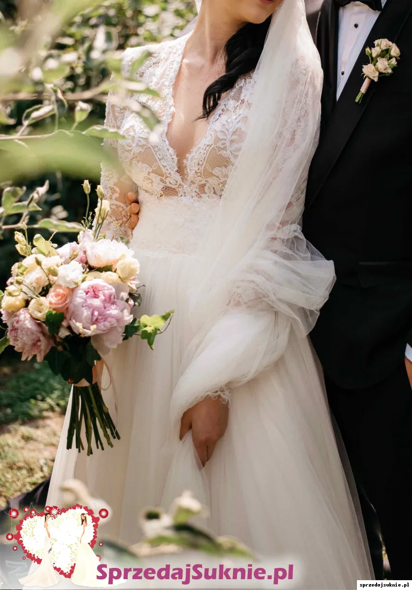 Sprzedam suknię Tarik Ediz z koronkową górą, głębokim dekoltem i długim rękawem. Piękne plecy zdobione guziczkami. Suknia kupiona w salonie Madonna w Warszawie na wymiar - 173 cm + 5 cm obcas przy wadze 58 kg. Po profesjonalnym czyszczeniu.