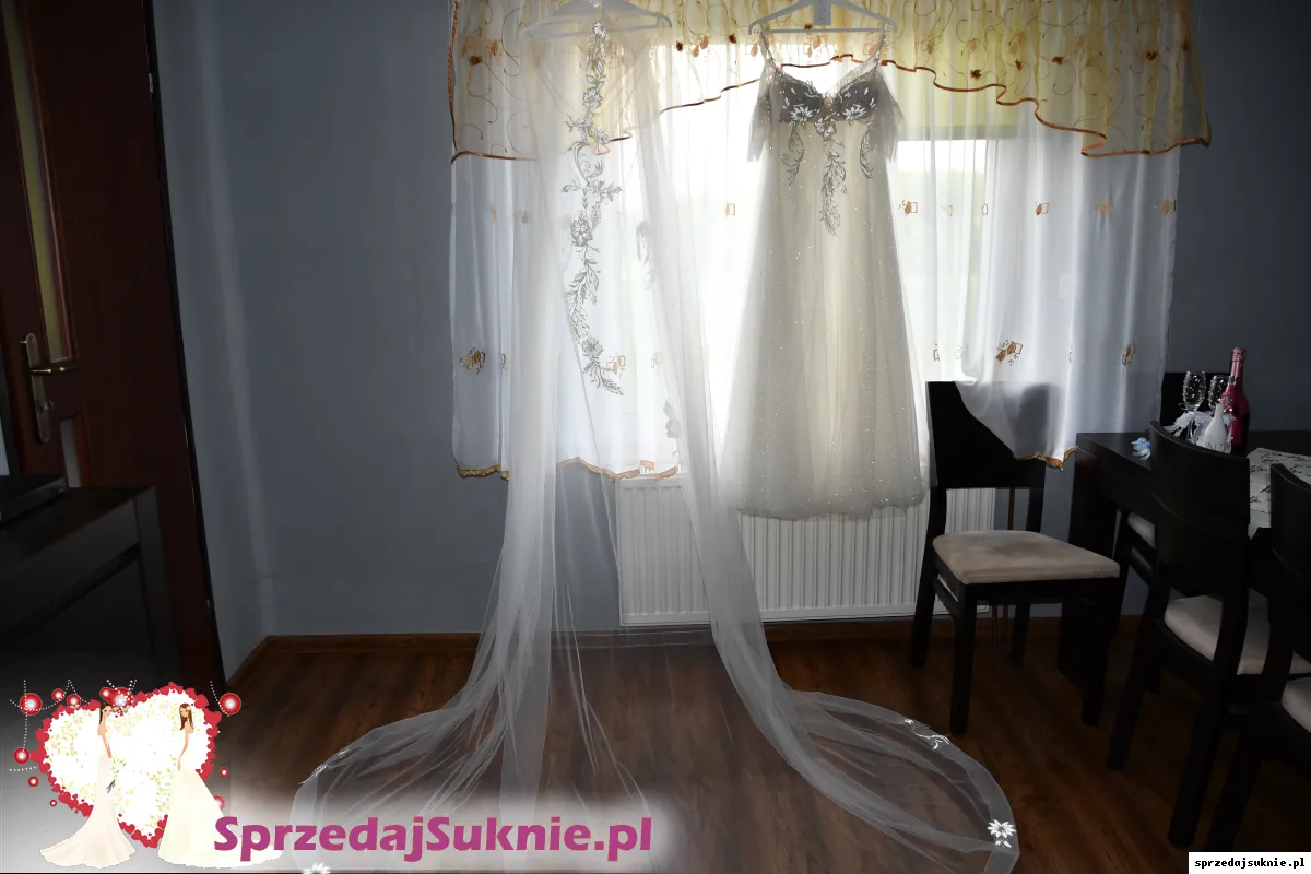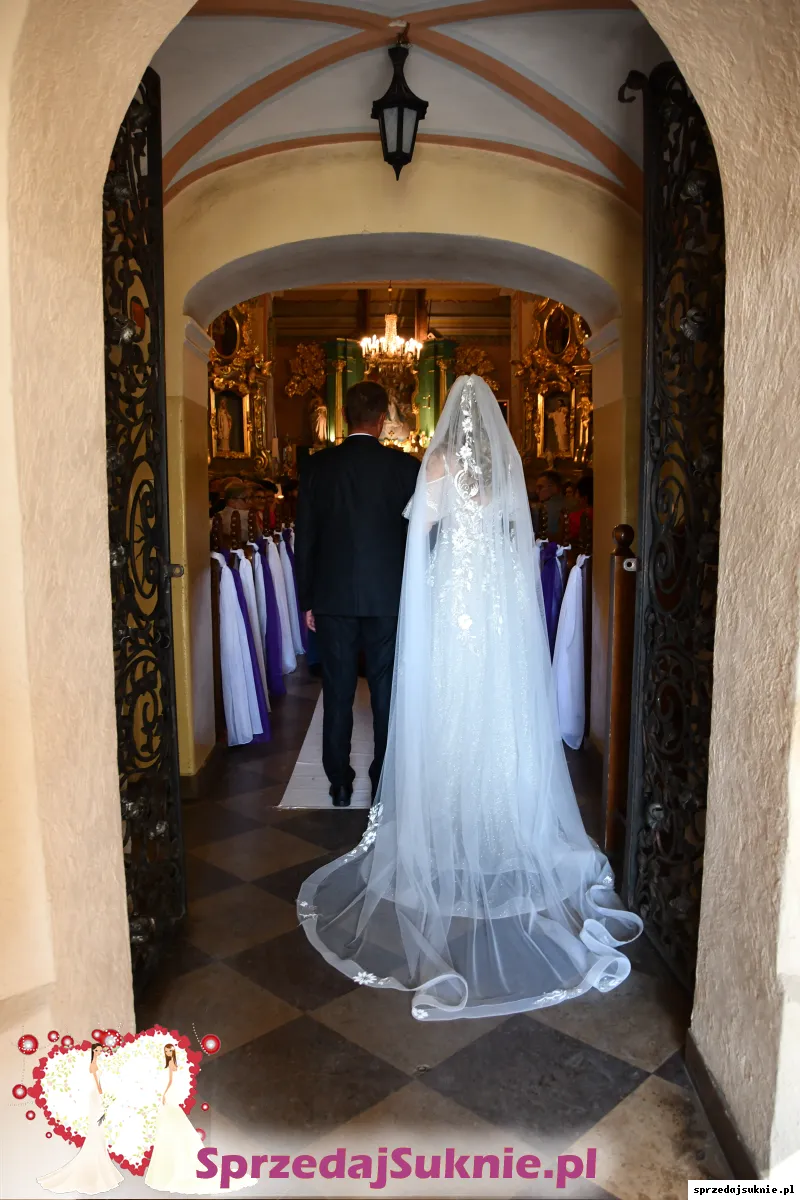 Suknia ślubna + tren (odpinany) + welon katedralny; zestaw z oryginalnym haftem