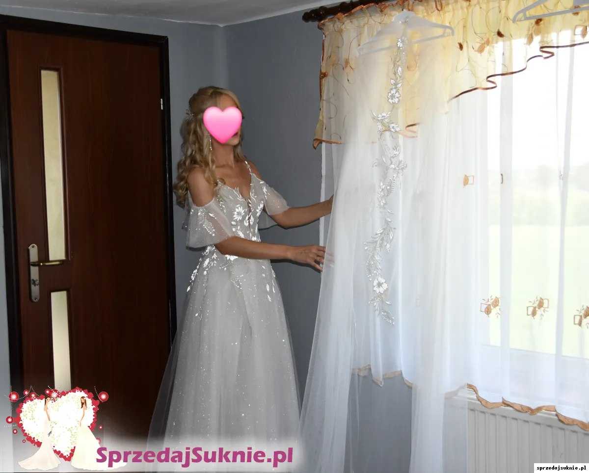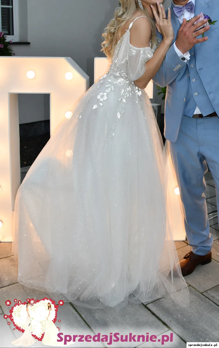 Suknia ślubna szyta w salonie według własnego projektu z oryginalnym haftem. W zestawie jest suknia, dopinane rękawki oraz tren. Obie rzeczy są dopinane na zatrzaski, których nie widać po odpięciu elementów. Do zestawy należy również welon katedralny z naszytym wzorem (3m)- identycznym jak na sukni. Całość jest spójna. Suknia posiada rozporek zakładany, przez co na pierwszy rzut oka jest niewidoczny. Materiał pięknie mieni się w słońcu oraz w świetle sztucznym na sali. Szyta na rozmiar S, wzrost 175cm + 8 cm obcas. Istnieje możliwość dopasowania sukni pod siebie. Kolor: ciepła biel. Cena z salonu zestawy to 6000 zł.
