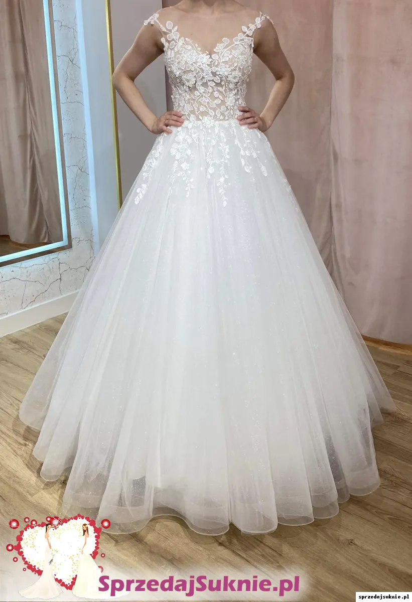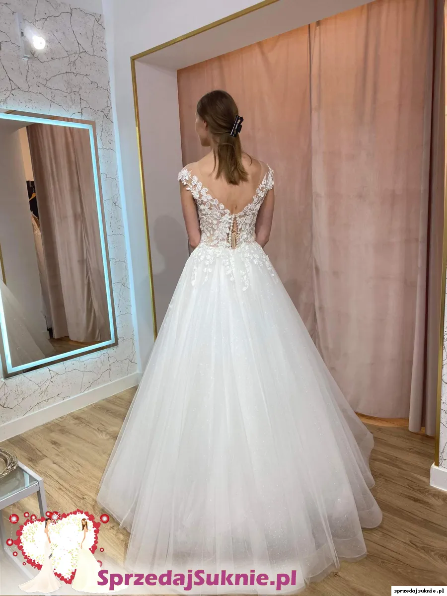 Suknia ślubna na 170cm + 5cm obcas. Suknia w stylu księżniczki, na kole. Suknia ma gorset wiązany i "koszulkę" zapinaną na guziki. Suknia ma kilka warstw tiulu w tym warstwy brokatowe, dzięki czemu pięknie się mieni. Suknia jest po praniu oraz drobnych naprawach, więc nie wymaga wkładania w nią dodatkowych kosztów z tym związanych.