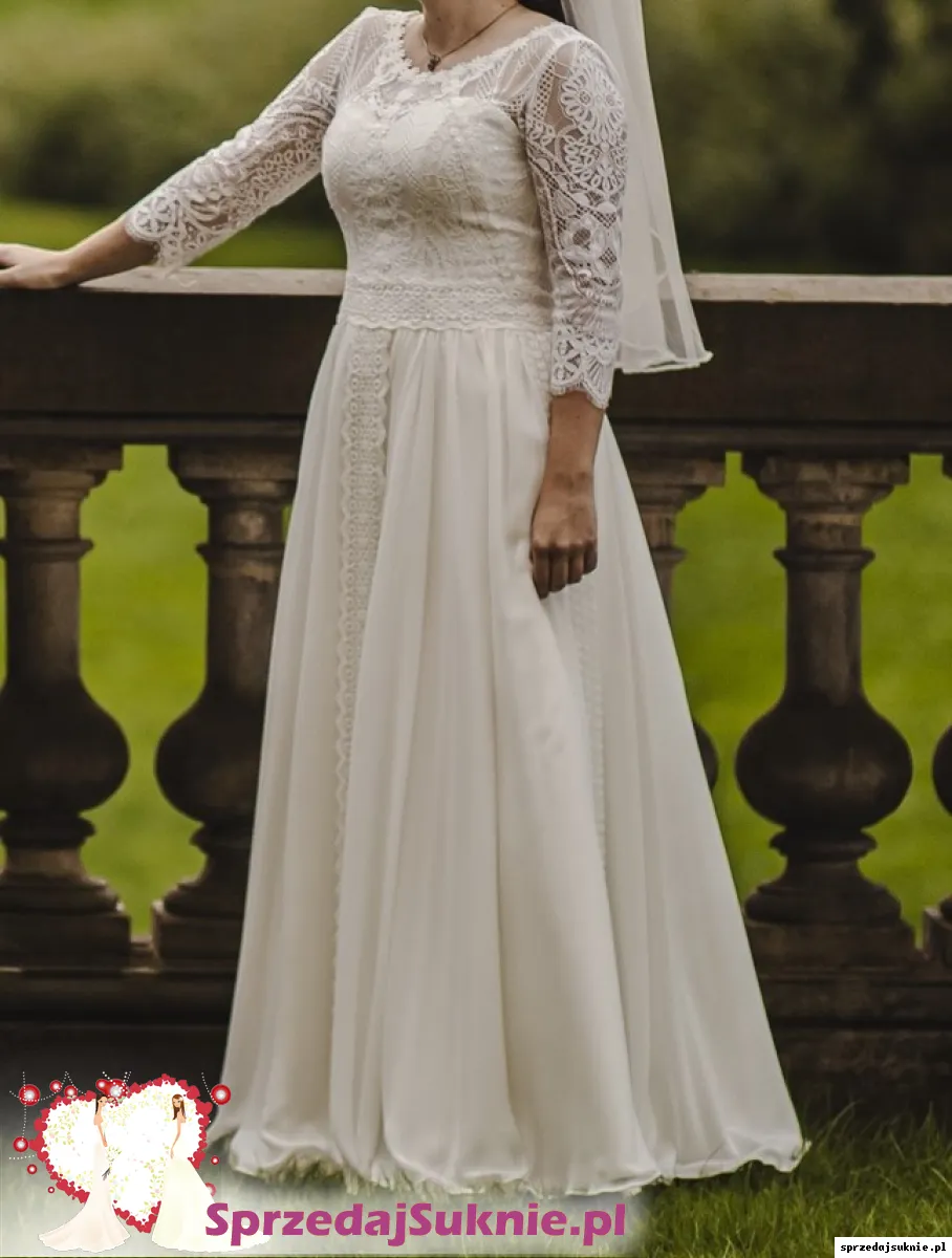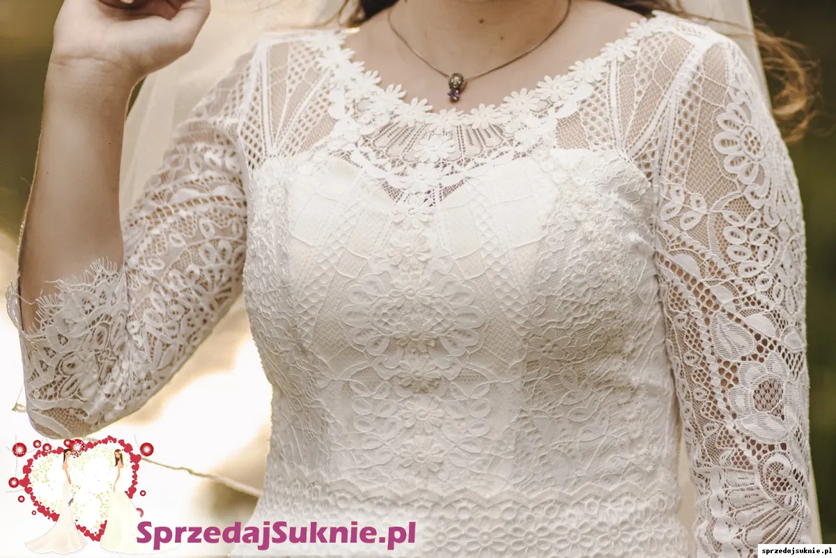 Pięknie zdobiona góra i rękawy 3/4, starannie wykończone. Jest możliwość wszycia w dół koła. Suknia jest w bardzo dobrym stanie, ubrana tylko na wesele i sesję poślubną.