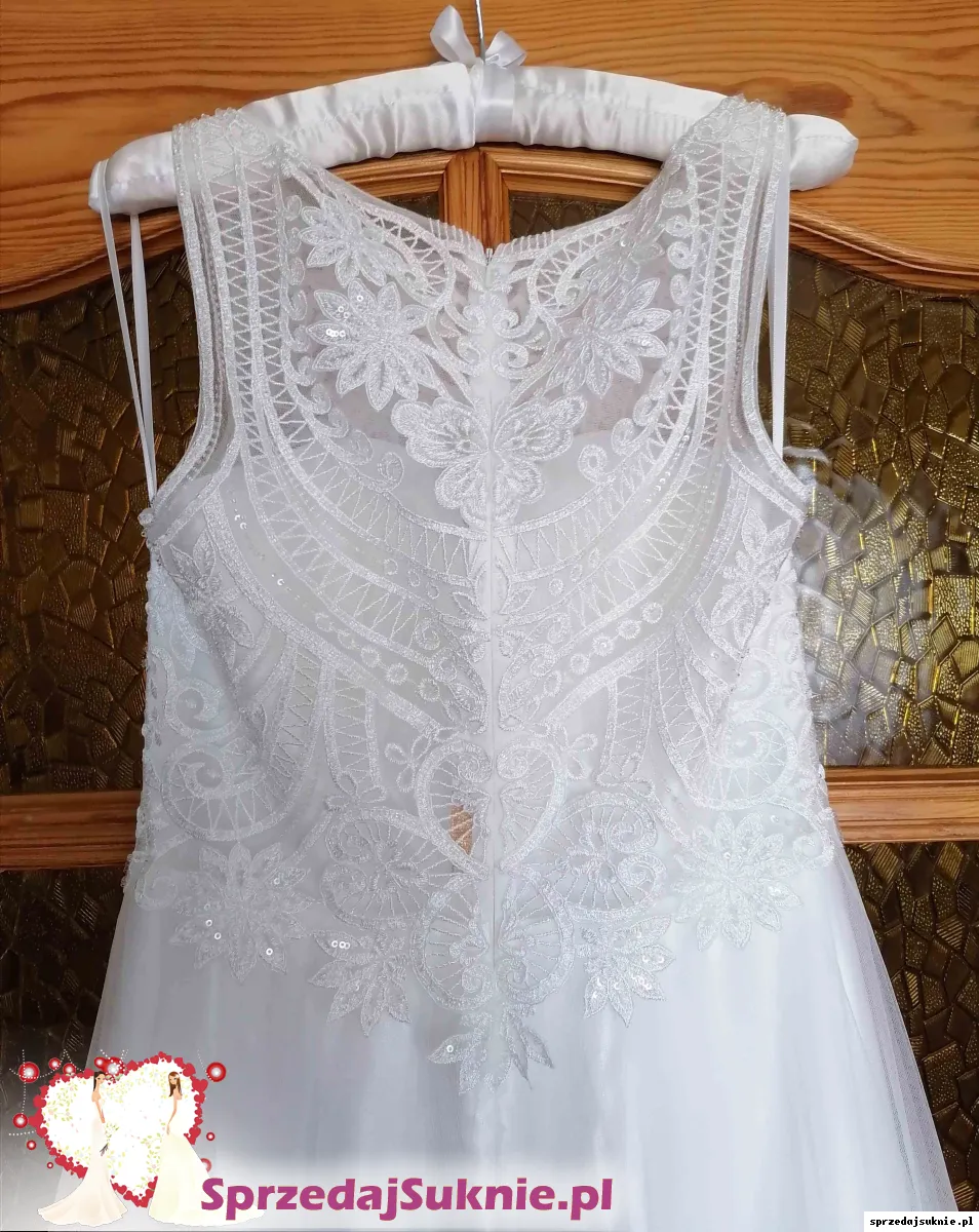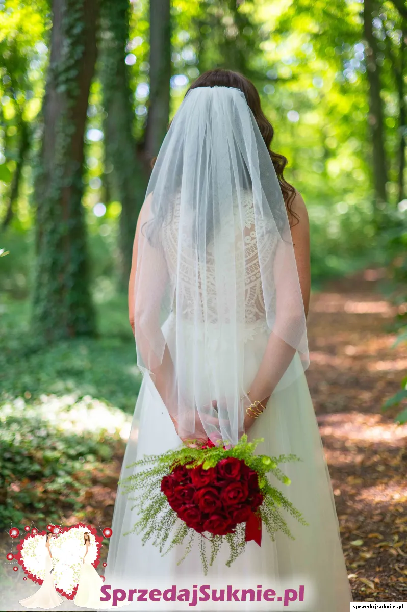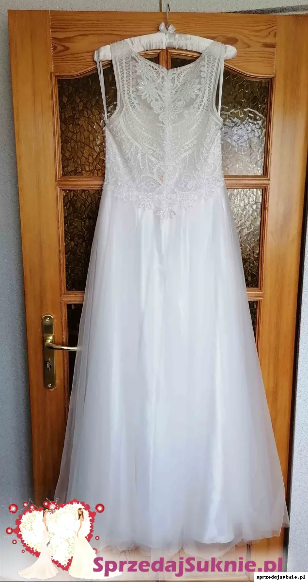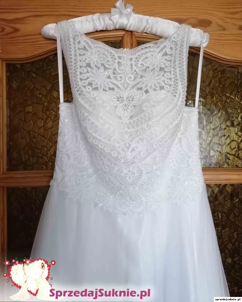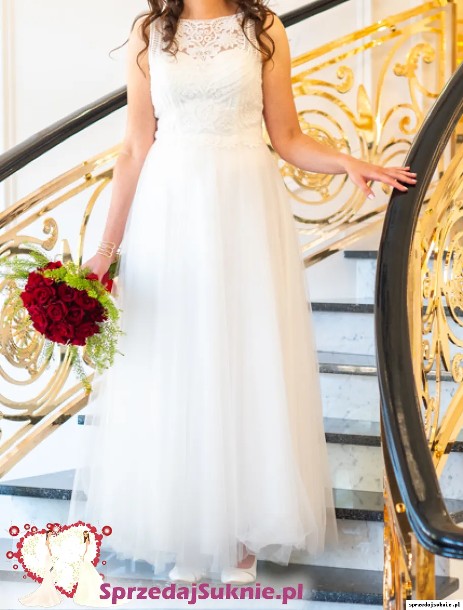 Tiulowa suknia ślubna z zabudowaną tłoczoną koronkową górą