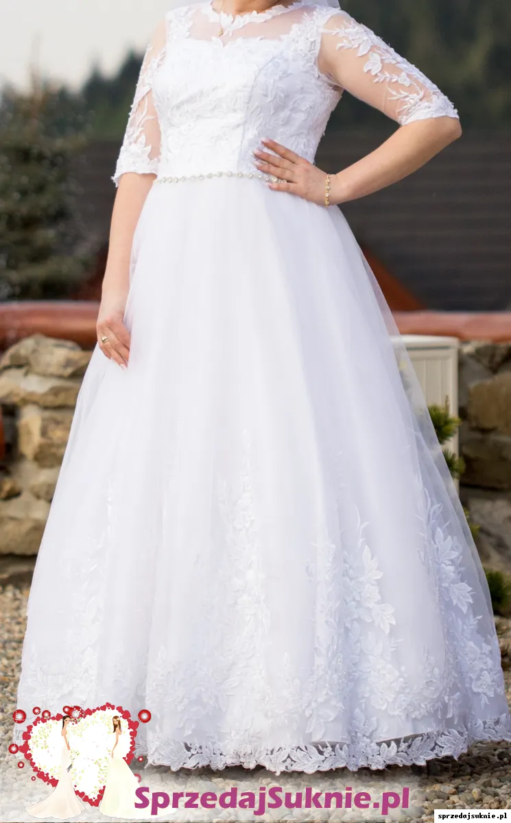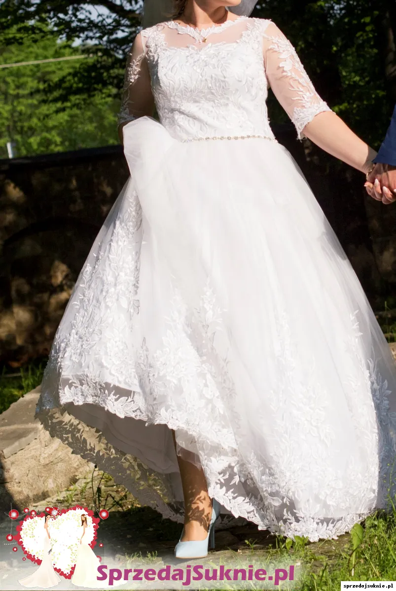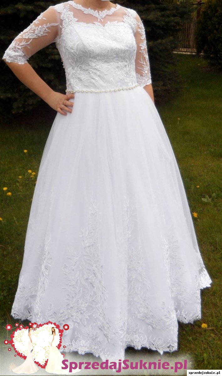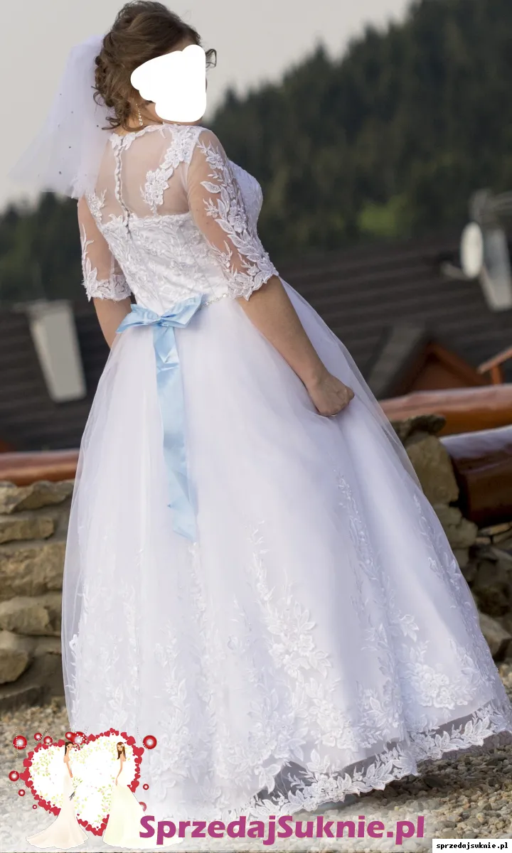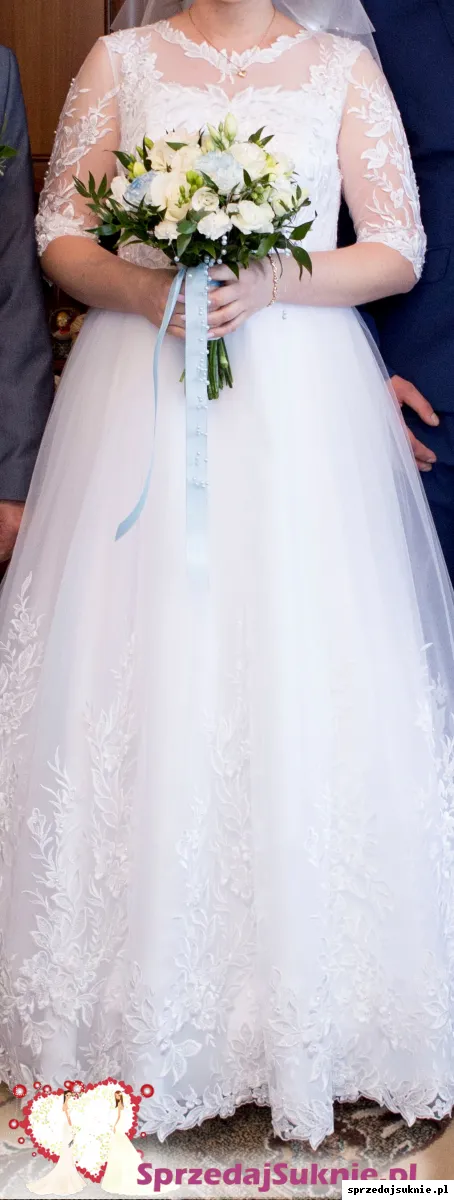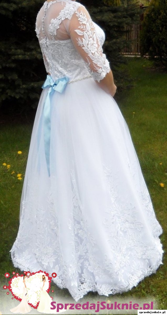 Sprzedam piękną śnieżno-białą sukienkę ślubną szytą ma zamówienie w rozmiarze M/L. Suknia posiada z tyłu kokardę w kolorze błękitnym oraz paseczek w pasie z ozdobnych diamentów. Góra sukienki oraz rękawki 3/4 wykonane są z francuskiej koronki podobnie jak kwiaty na dole sukni które ułożone są na tiulu na wzór pnącz kwiatowych. Na koronce która zdobi większość sukienki znajdują się ozdobne małe kryształki które błyszczą się w świetle. Sukienka szyta jest na wzrost ok 170cm+ szpilka. Do sukienki posiadam halkę na kole oraz w komplecie welon tiulowy na grzebyku z koronką zdobiony małymi cyrkoniami typu Swarovskiego. Zapraszam do przymiarki osobiście oraz do zakupu. Sukienka jest prawie jak nowa, wogóle niezniszczona. Do sukienki daję w gratisie oryginalny pokrowiec oraz w prezencie dla nowej właścicielki sukienki podusię na obrączki szytą z tych samych materiałów oraz pudełko na koperty w komplecie.