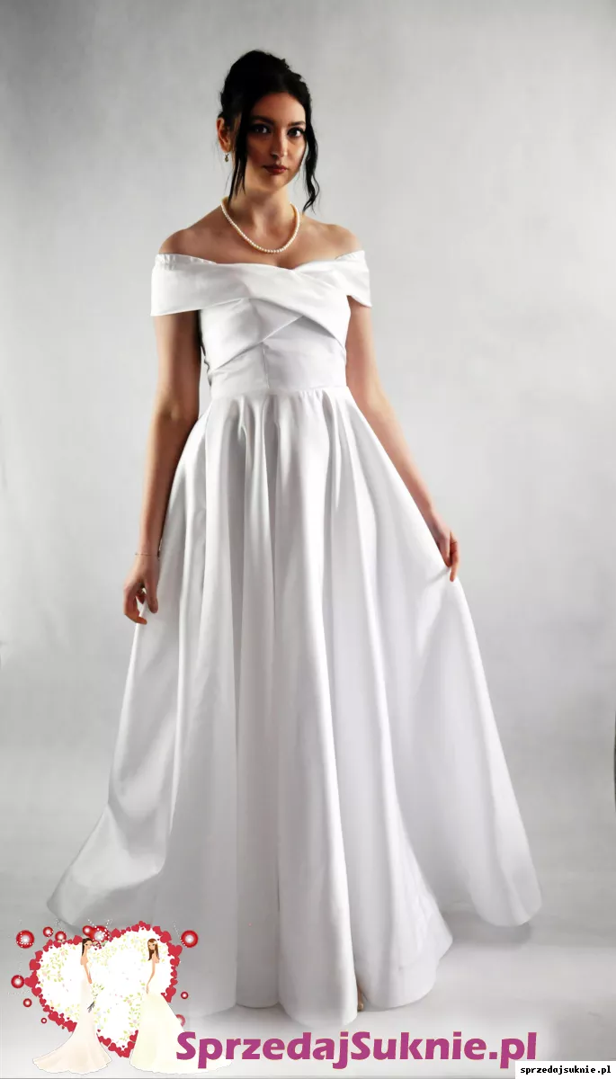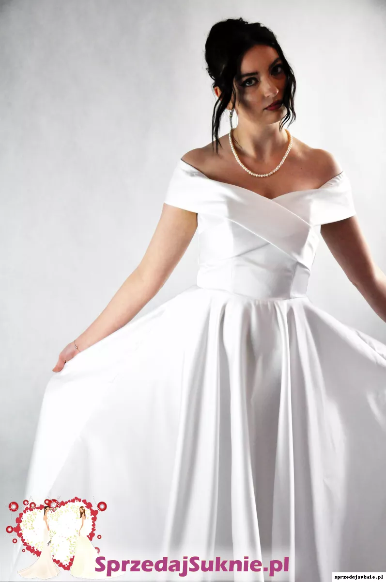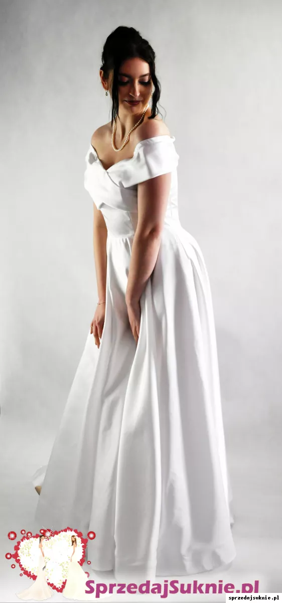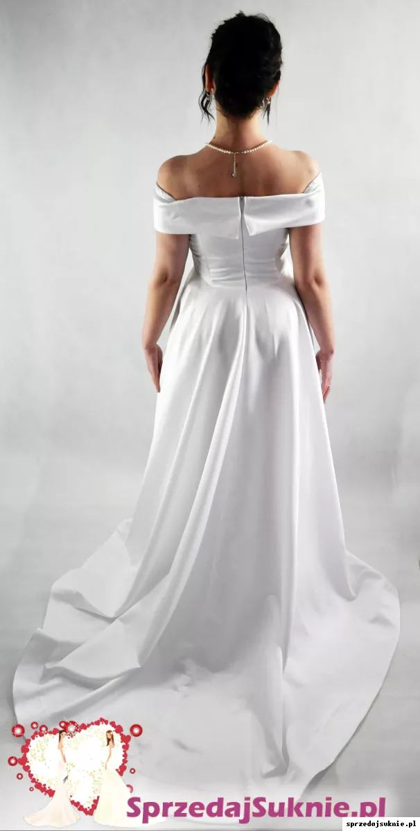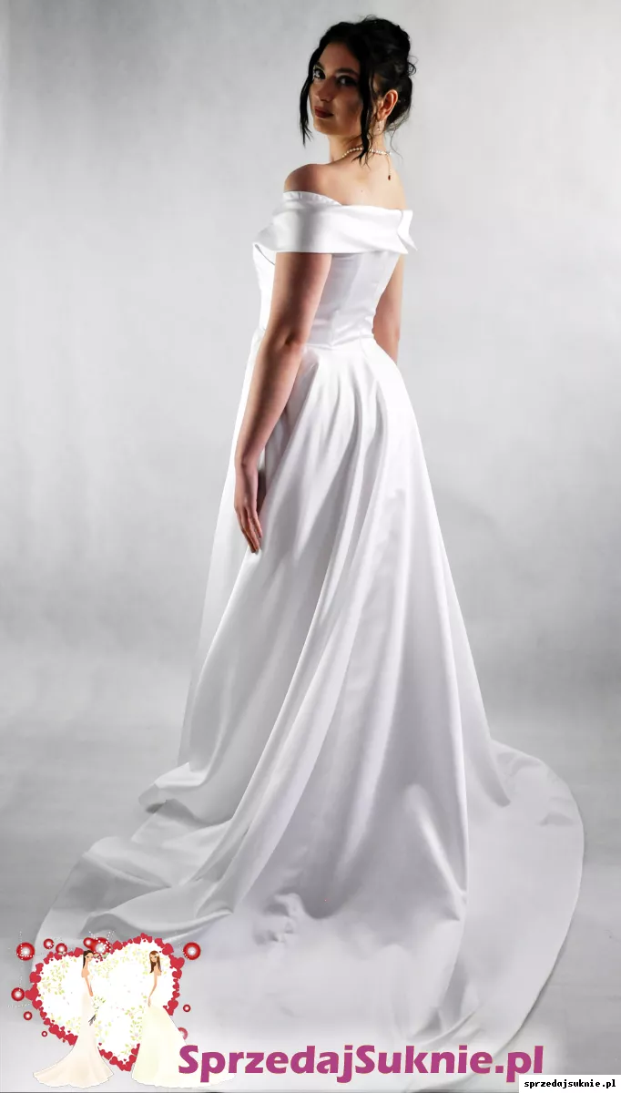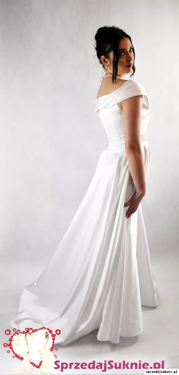 Pi臋kna satynowa suknia 艣lubna z delikatnym trenem.