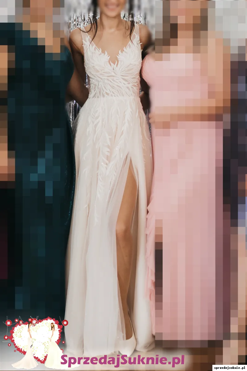 Suknia posiada dwa rozcięcia, po obu stronach. Ma wszyte miseczki na biust. Tiul w sukience nie jest porwany. Ogólnie jest w stanie bardzo dobrym.