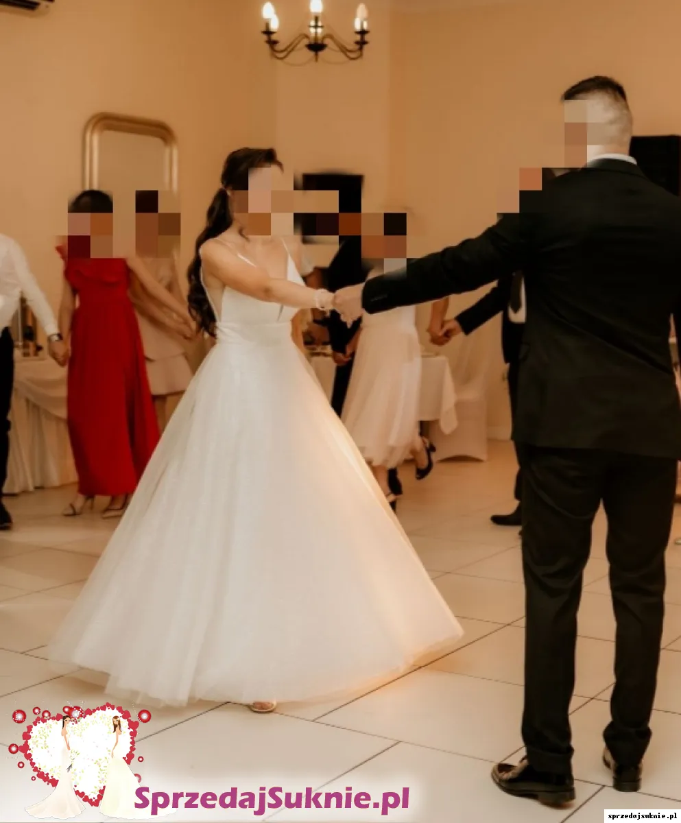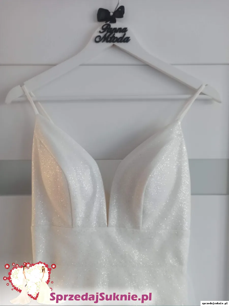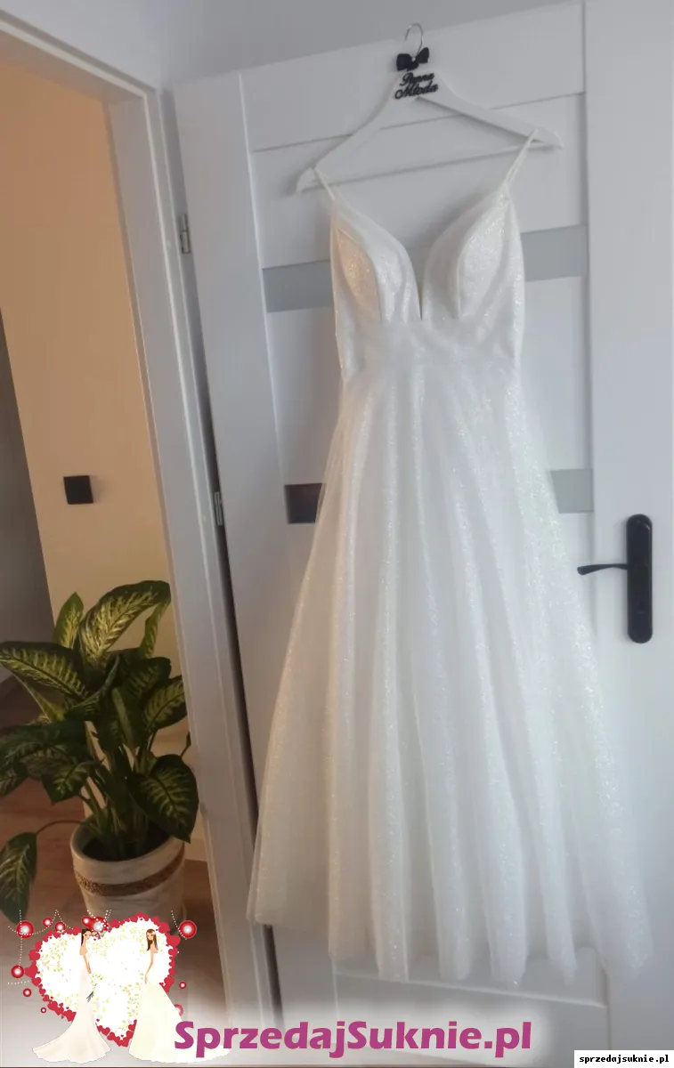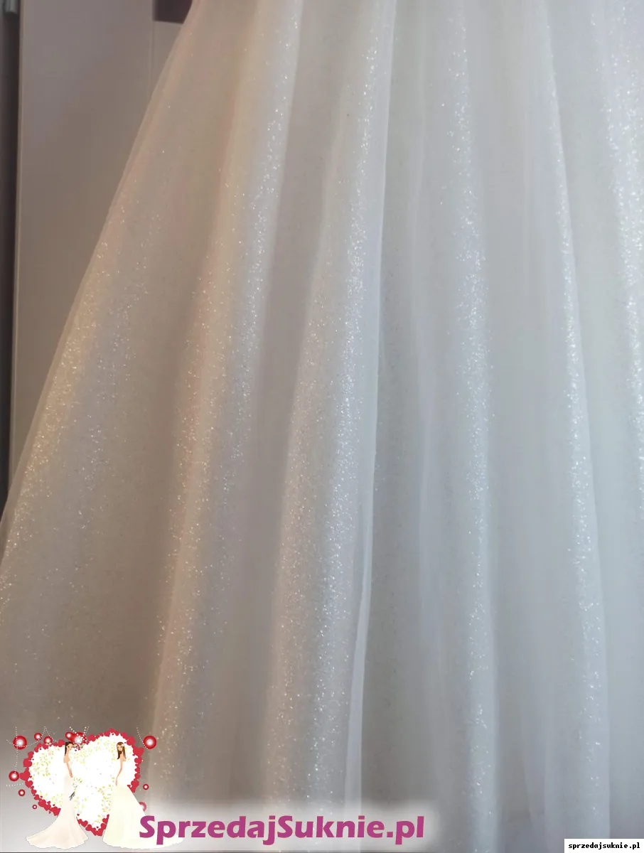 Suknia skromna bez żadnych koronek i koralików a zarazem bardzo elegancka. Cała pokryta mieniącymi drobinkami dzięki czemu prezentuję się pięknie. Dla Pani o wzroście +/- 160cm.