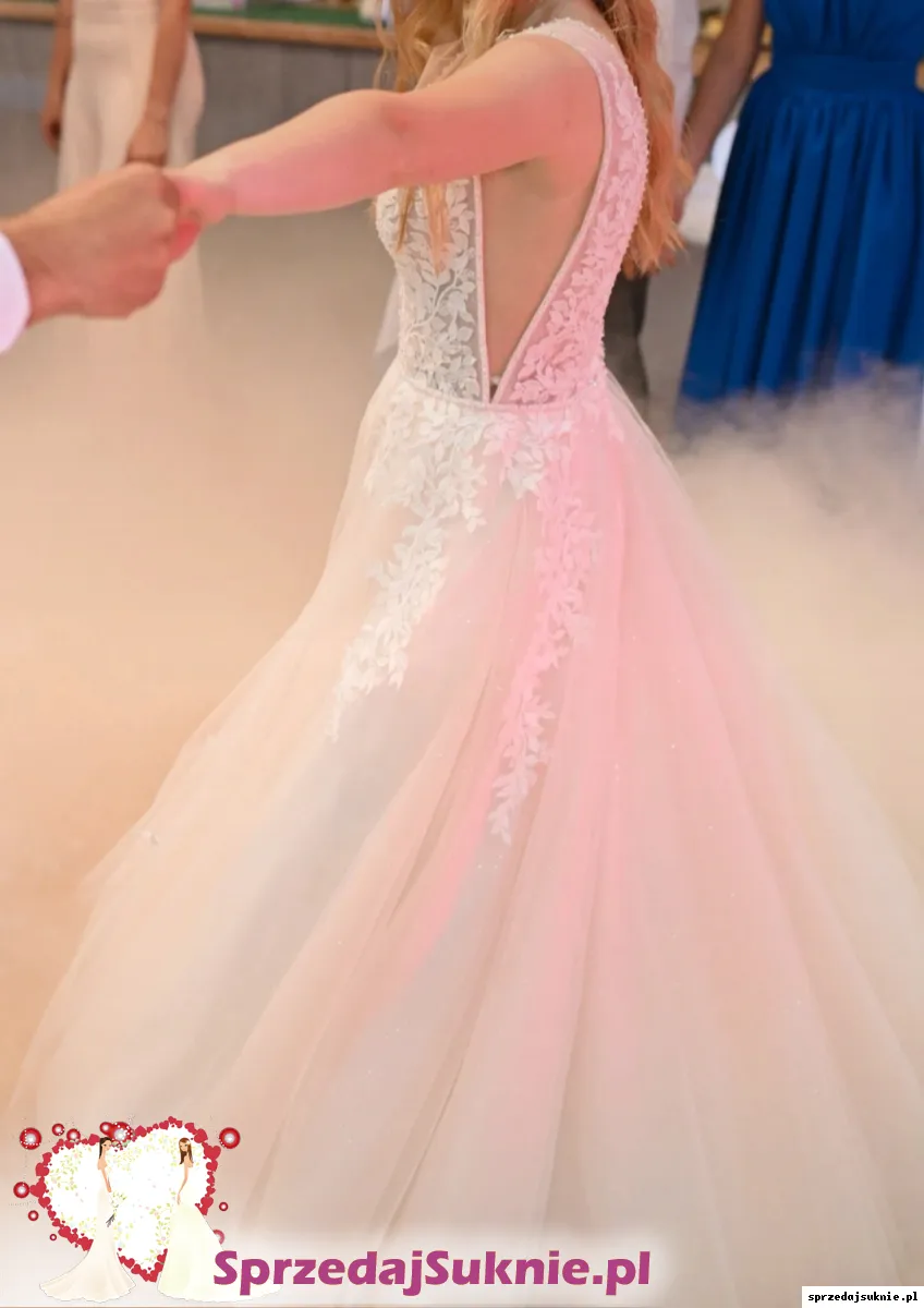 na sprzedaż posiadam suknie ślubną ecru w rozmiarze XS/S w stanie bardzo dobrym, suknia posiada gorset więc można regulować ją dodatkowo w talii oraz posiada dekoracyjne zapięcie na kryształowe guziczki, które są widoczne na zdjęciach. Do sukni wszyte są miseczki w rozmiarze B. Cały dekolt posiada siateczkę aż do szyi przez co suknia ładnie dolega do ciała. Błyszczący tiul powoduje, że suknia się pięknie mieni co zdecydowanie dodaje jej uroku.