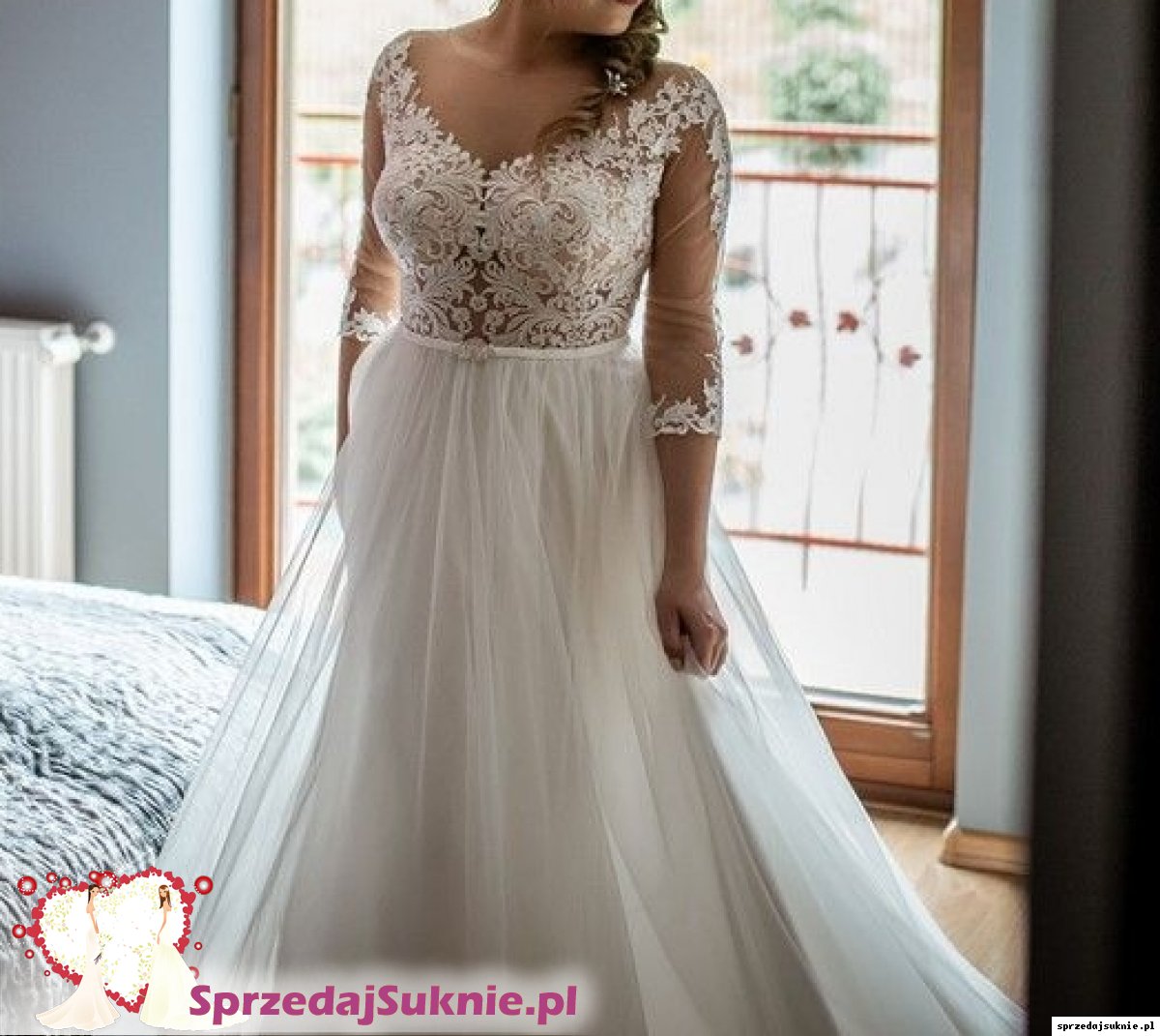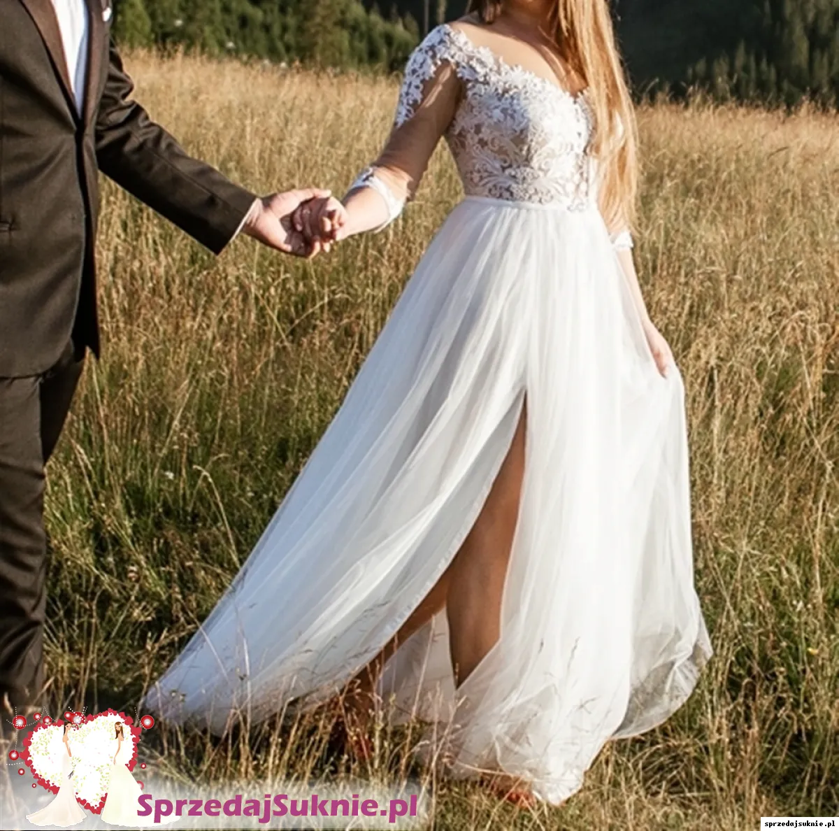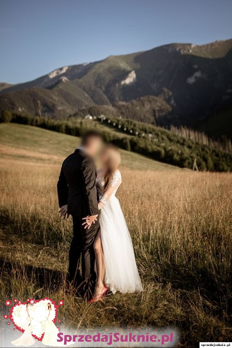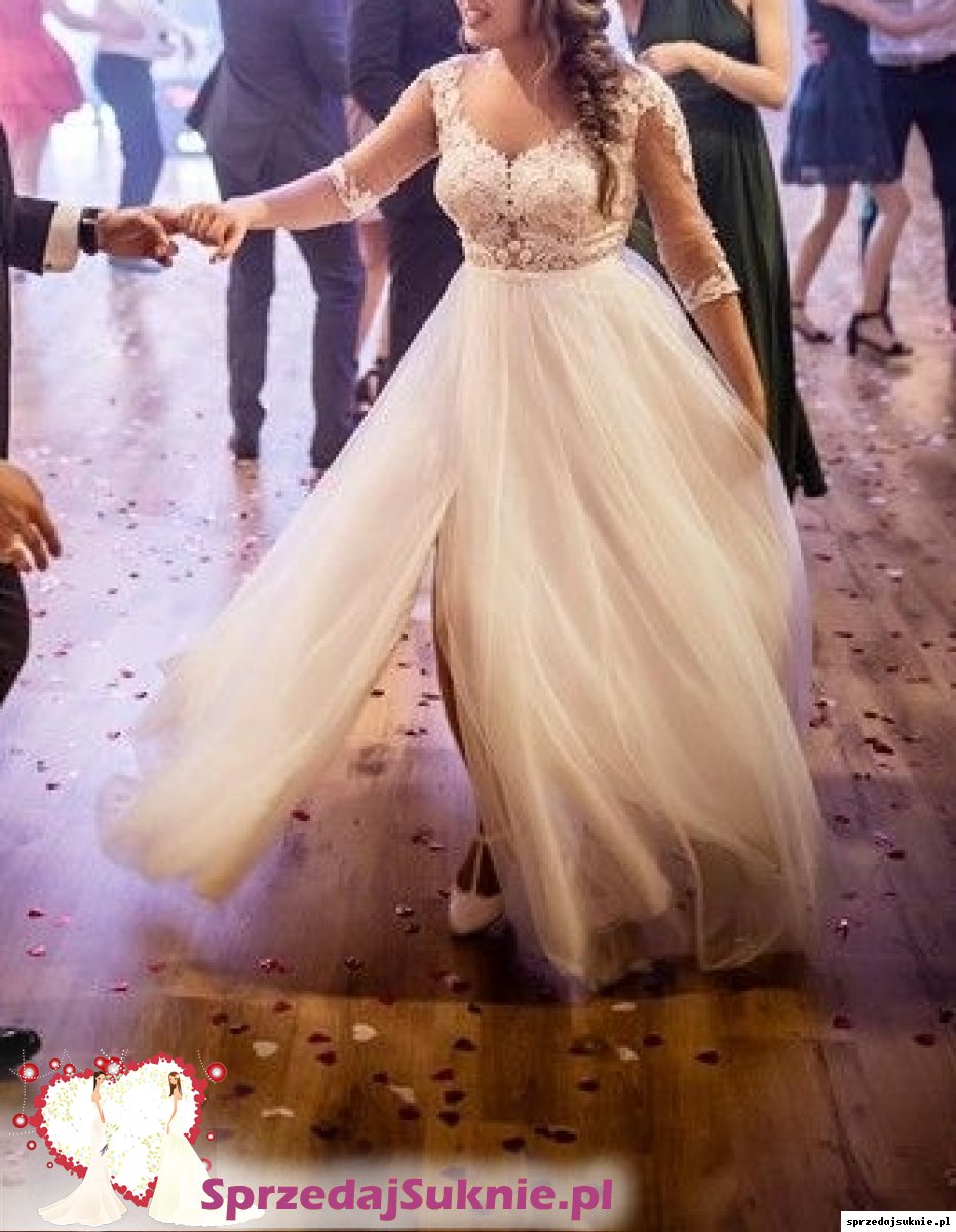 Sprzedam suknię ślubną zakupioną w salonie sukien ślubnych Kaledonia. Rozmiar 36, na wzrost 160cm + obcas 8cm. Suknia na górze posiada piękne, delikatne i unikatowe zdobienie. Dół sukni składa się z dwóch warstw tiulu i podszewki z rozcięciem dzięki czemu jest bardzo lekka, zwiewna, wygodna i pięknie układa się w tańcu. Góra delikatnie się mieni dodając jej blasku. Suknia posiada wszyte miseczki, a nad dekoltem wszyta jest delikatna cielista siateczka, która zlewa się z ciałem. Kolor to śmietankowa biel. Suknia jest po czyszczeniu chemicznym. Kosztowała 4200zł. Osoby zainteresowane zapraszam do kontaktu i ewentualnej przymiarki.