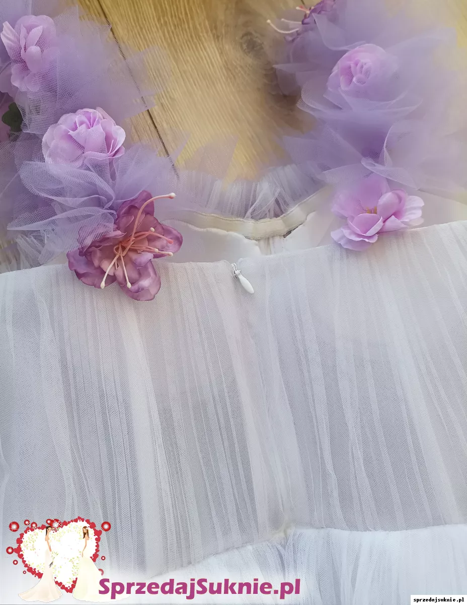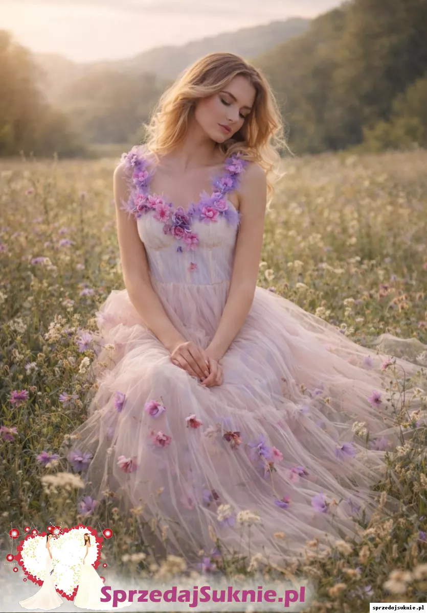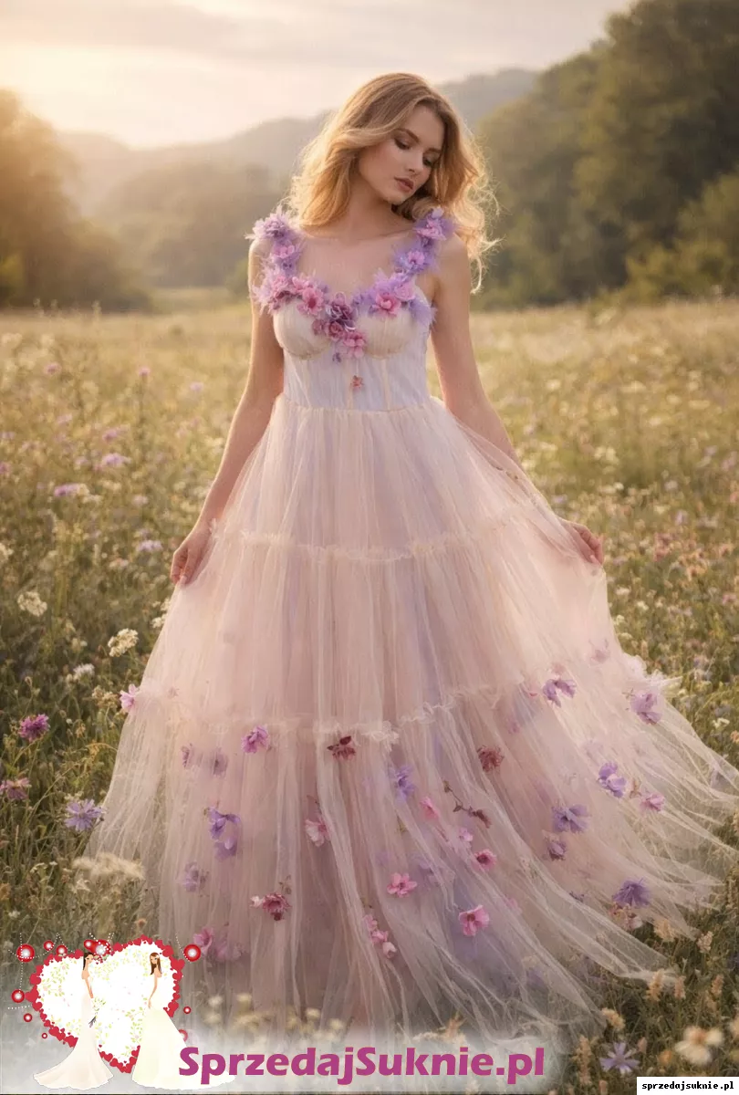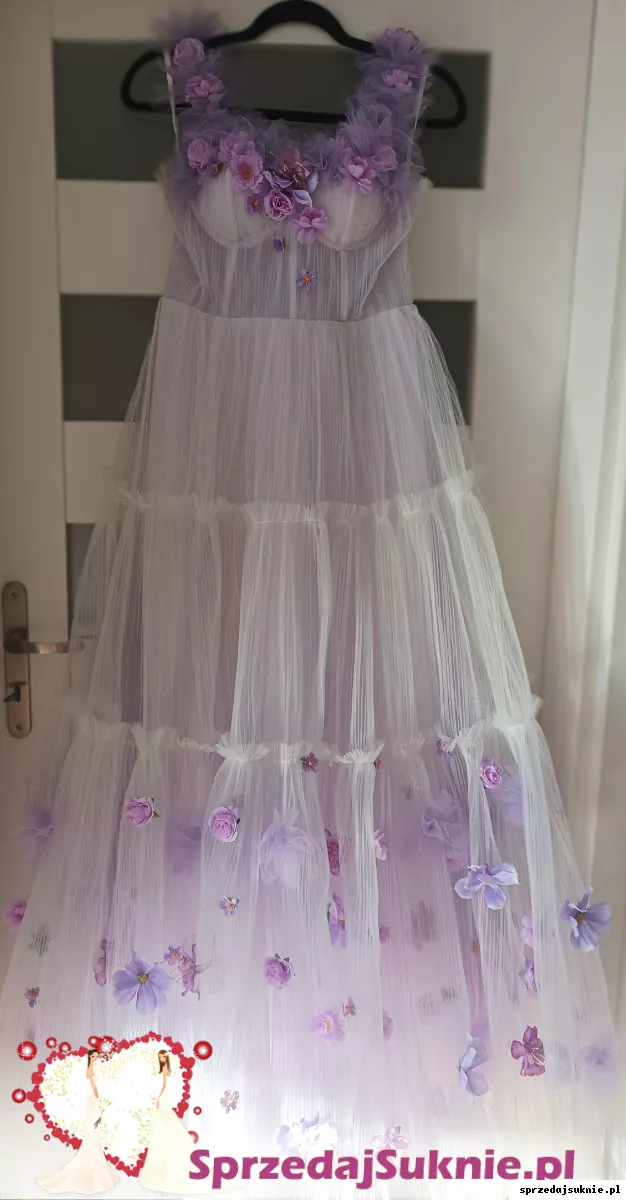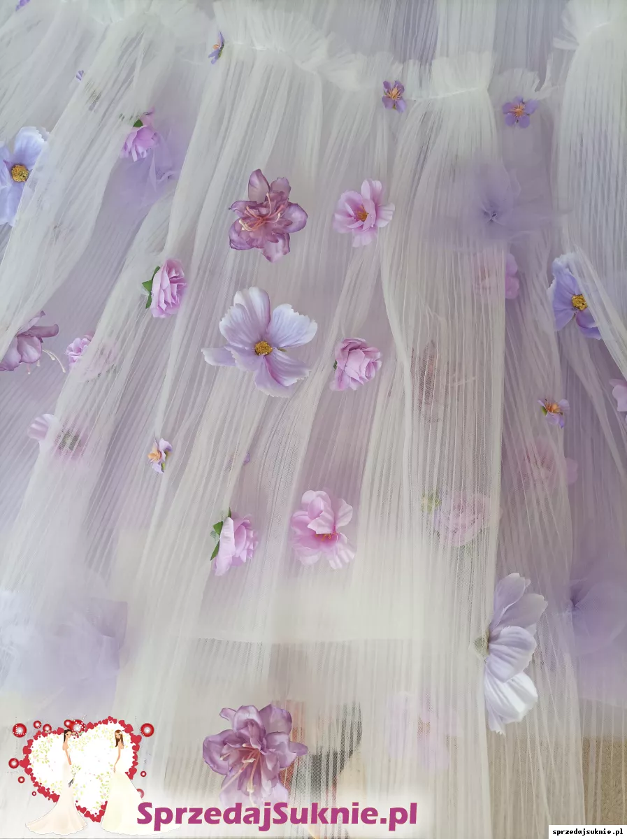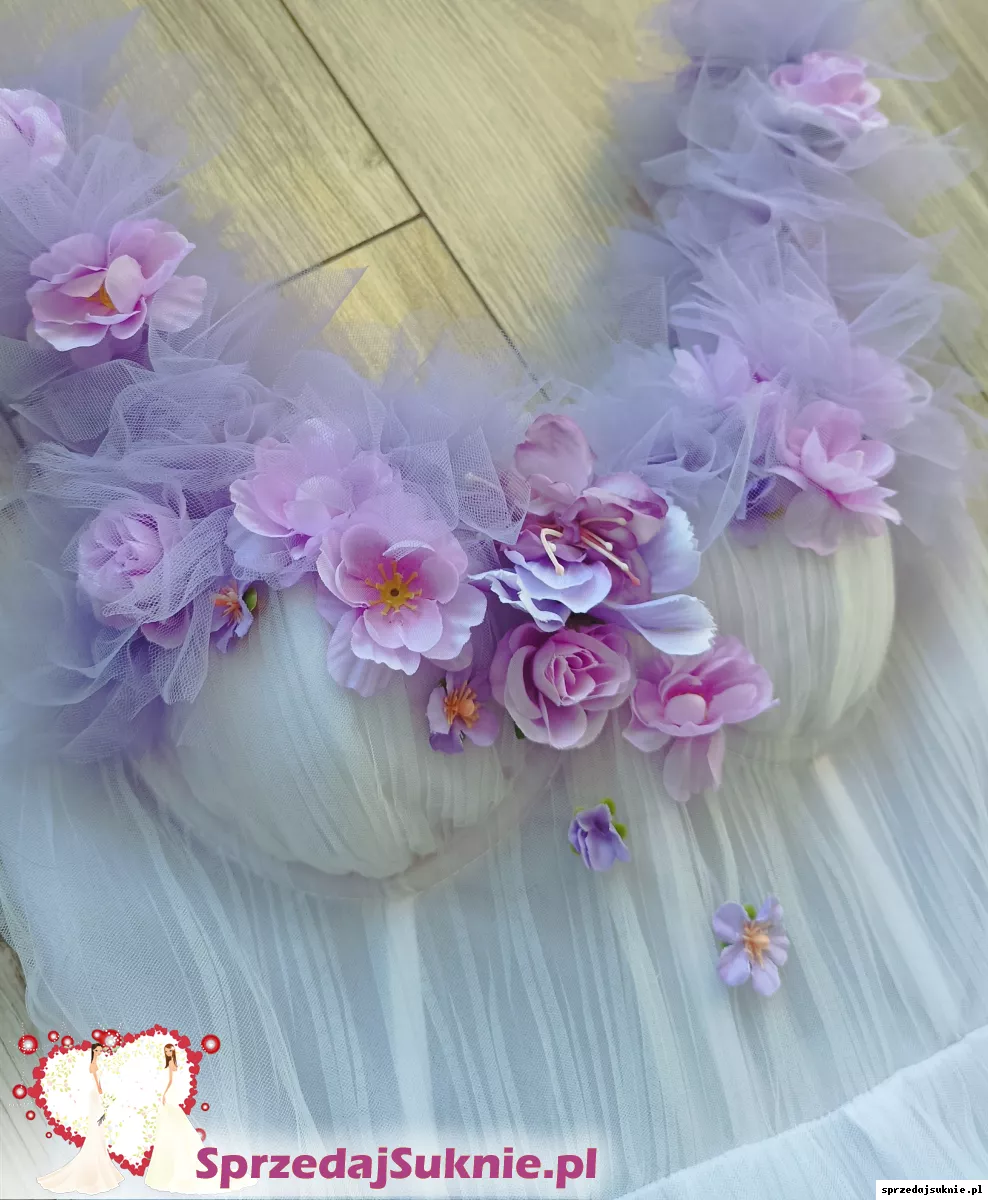 Jestem krawcową i moją pasją jest projektowanie i szycie oryginalnych, niestandardowych sukienek ślubnych.Inspiracją dla tego wzoru była wiosenna łąka pełna kwiatów.Styl boho bardzo kobiecy i romantyczny.Została uszyta z białego plisowanego tiulu z dodatkiem dwóch warstw tiulu liliowego, co nadaje całości lekko fioletową poświatę.Gorset usztywniany fiszbinami z dodanymi miseczkami wypełniający i podtrzymujący biust.Zapinana na plecach zamkiem krytym zakończony haftką.Ozdobiona ręcznie wykonanymi różnej wielkości kwiatkami.Wymiary talia:70,biust:88,dł.od pasa w dół:116 Zapraszam serdecznie.