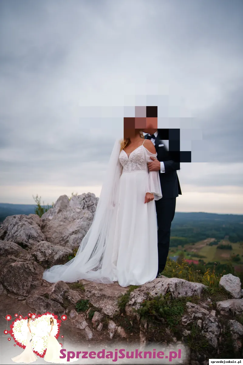 Witam, sprzedam swoją suknię ślubną w kolorze śmietankowym. Suknia szyta na rozmiar M, wzrost 165, wysokość obcasa 8 cm. Suknia posiada muślinowy dół (niemnący), oraz odpinane rękawy. Stan idealny. Suknię zakupiłam w salonie Charlotte w Kielcach. Po więcej informacji zapraszam do kontaktu telefonicznego.