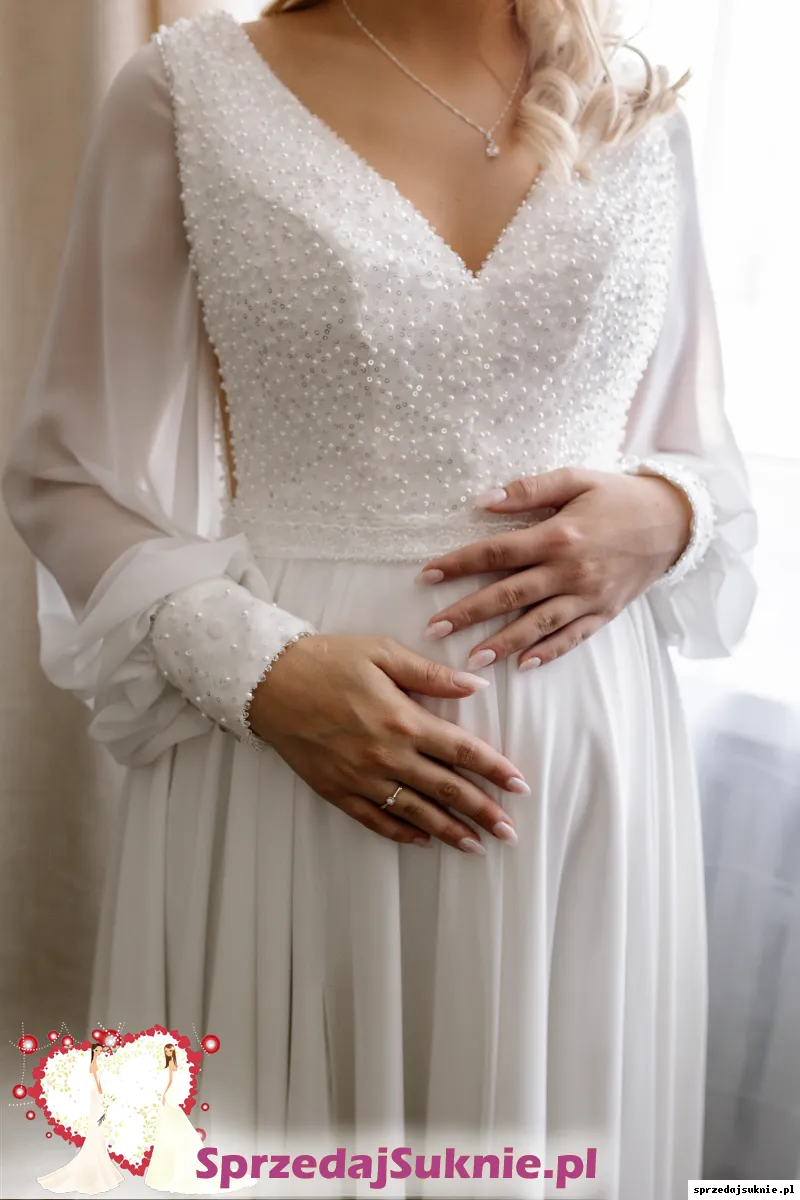 Sprzedam suknie ślubną zakupioną w salonie sukien ślubnych Antonella. Suknia idealna na brzuszek ciążowy tak jak u mnie , rozmiar 36/38 . Wzrost 160+5cm obcas. Jest w stanie idealnym, założona na ślub cywilny. Rękawki są odpinane .