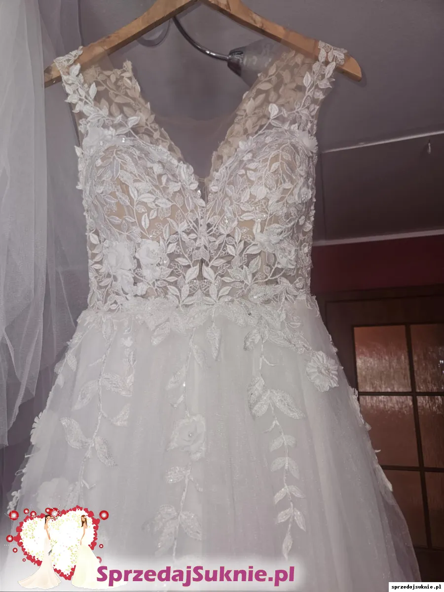 Suknia ślubna z salonu Destiny, śmietankowa biel, listki, tres i welony