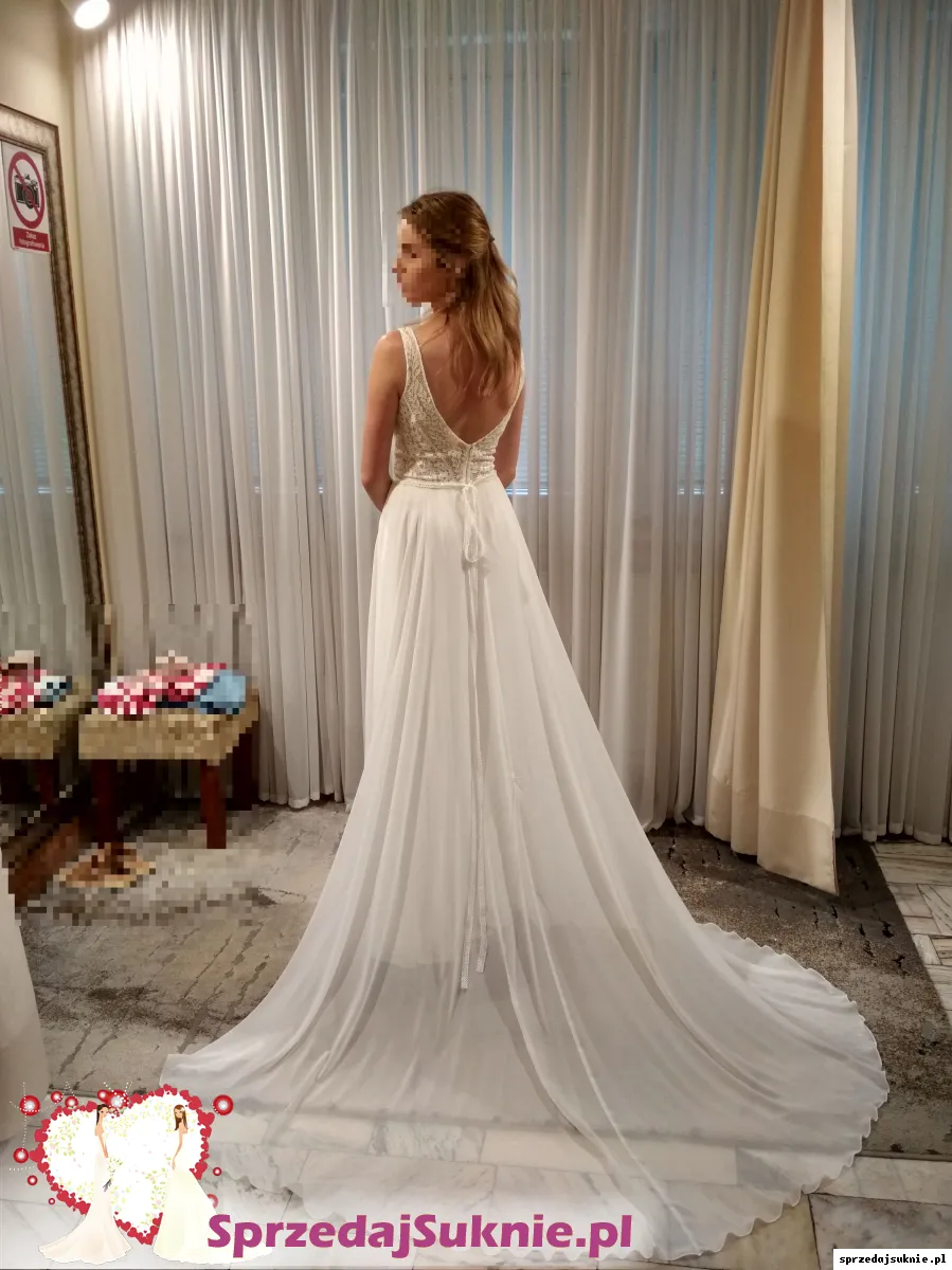Suknię sprzedam z pięknym, długim muślinowym trenem. Zapinanym na haftki pod koronką sukni. Można go podpiąć z tyłu sukni lub całkowicie odpiąć.