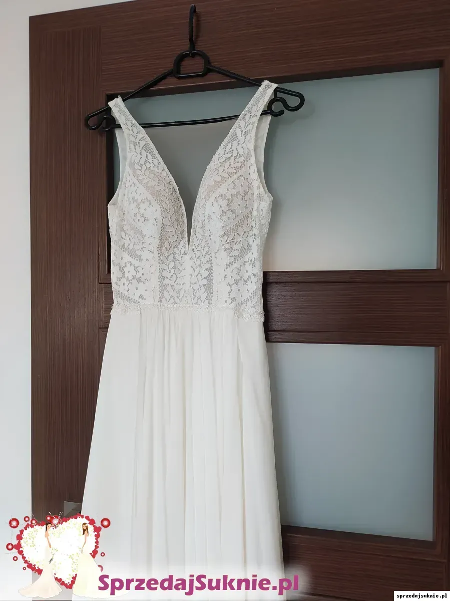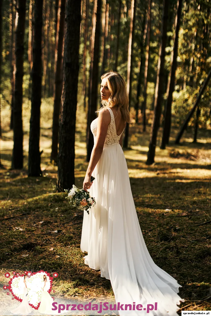 Suknia w kolorze śmietanki. Góra sukni wykonana z pięknej, subtelnej koronki wykończonej kryształkami Swarovskiego przy dekolcie (przód i tył) oraz w pasie. Na dekolcie posiada praktycznie niewidoczną siateczkę w kolorze ciała. Suknia ma wbudowane miseczki usztywnione z przodu lekkim stelażem pod biustem (dwa niewidoczne paseczki). Od spodu brzegi wykończone silikonowym paski, przez co suknia jest bardzo komfortowa.
