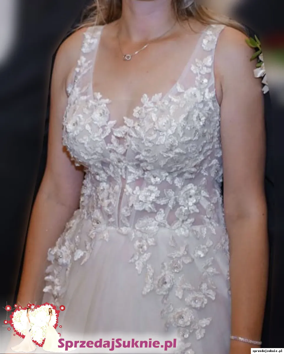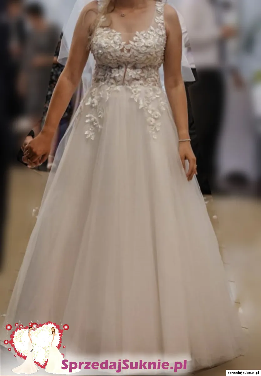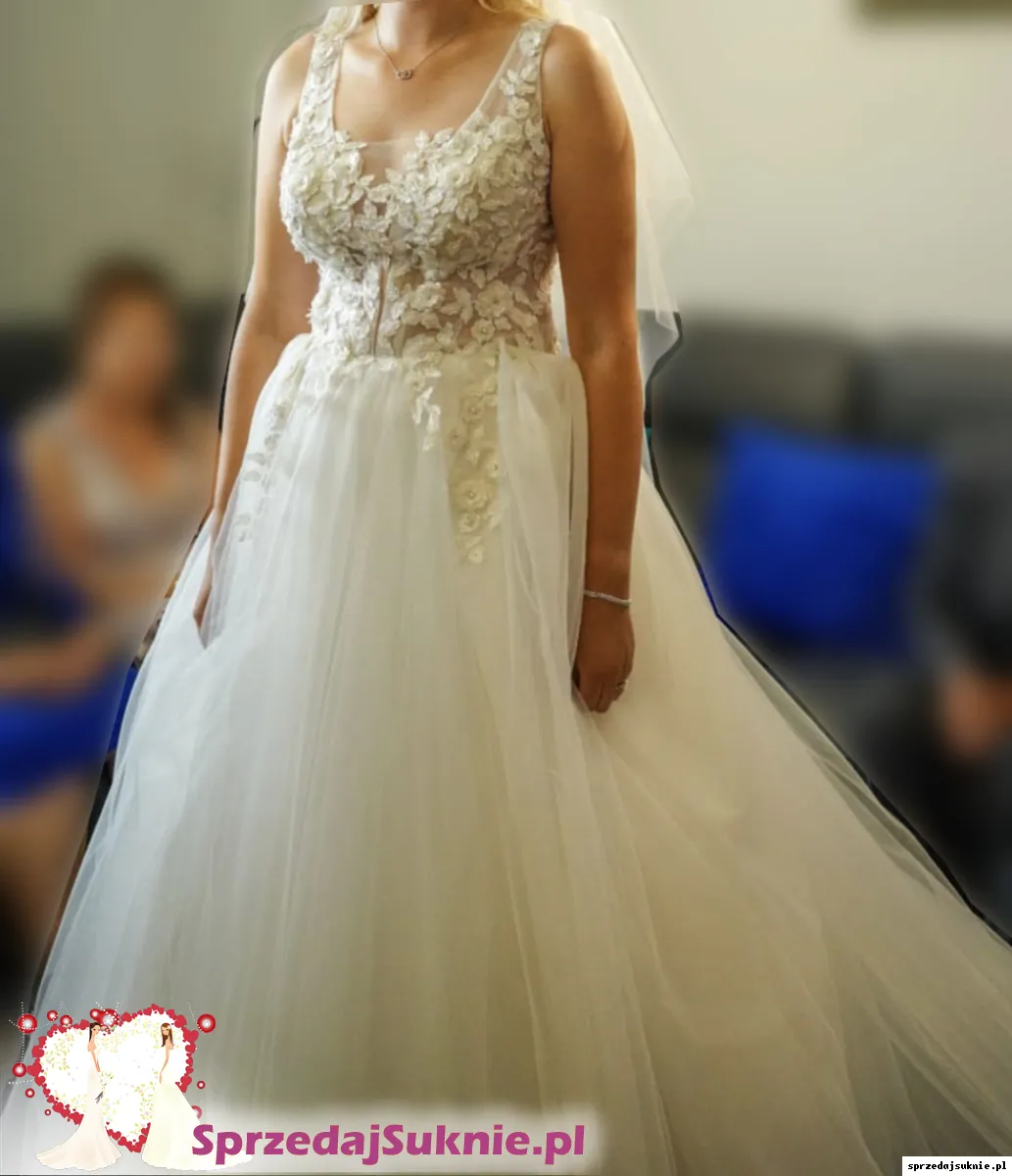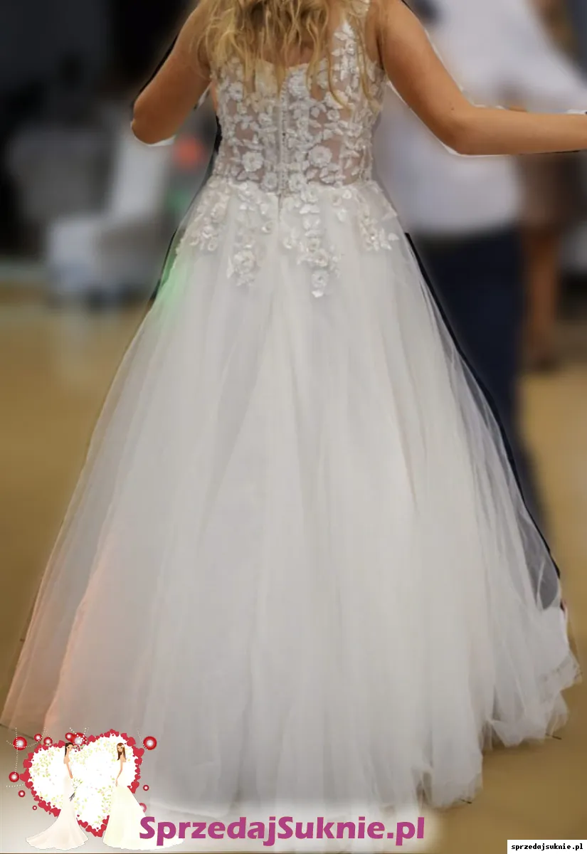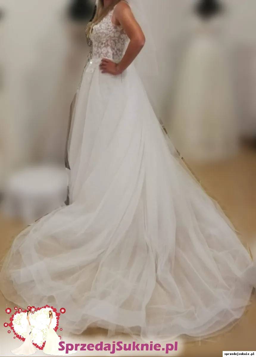 Sprzedam suknie ślubną z długim odczepianym trenem, założona tylko raz. Możliwość noszenia z kołem jak i bez.