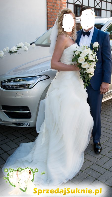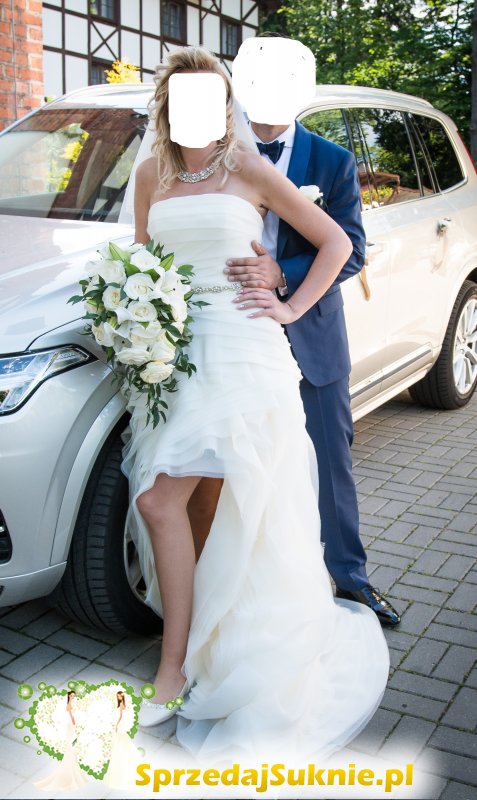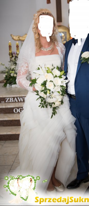 Sprzedam piękną suknię ślubną w rozmiarze 38-40 /wzrost od 165 cm w górę/ Suknia została zakupiona w USA, posiada pięknie układające się falbany z wyciętym przodem do kolan. Tył sukni wykończony jest trenem, który dodaje sukni uroku. Tren można podpiąć żeby nie przeszkadzał w tańcu. Podpięciem trenu można regulować długość sukni.Suknia ma kolor lekko kremowy. Do sukni mogę dodać haftowane bolerko, pasek, welony.
