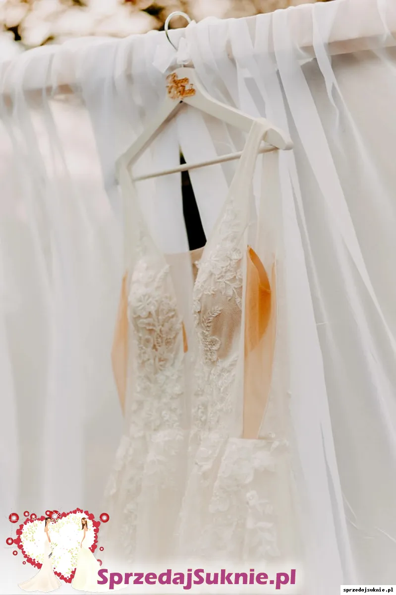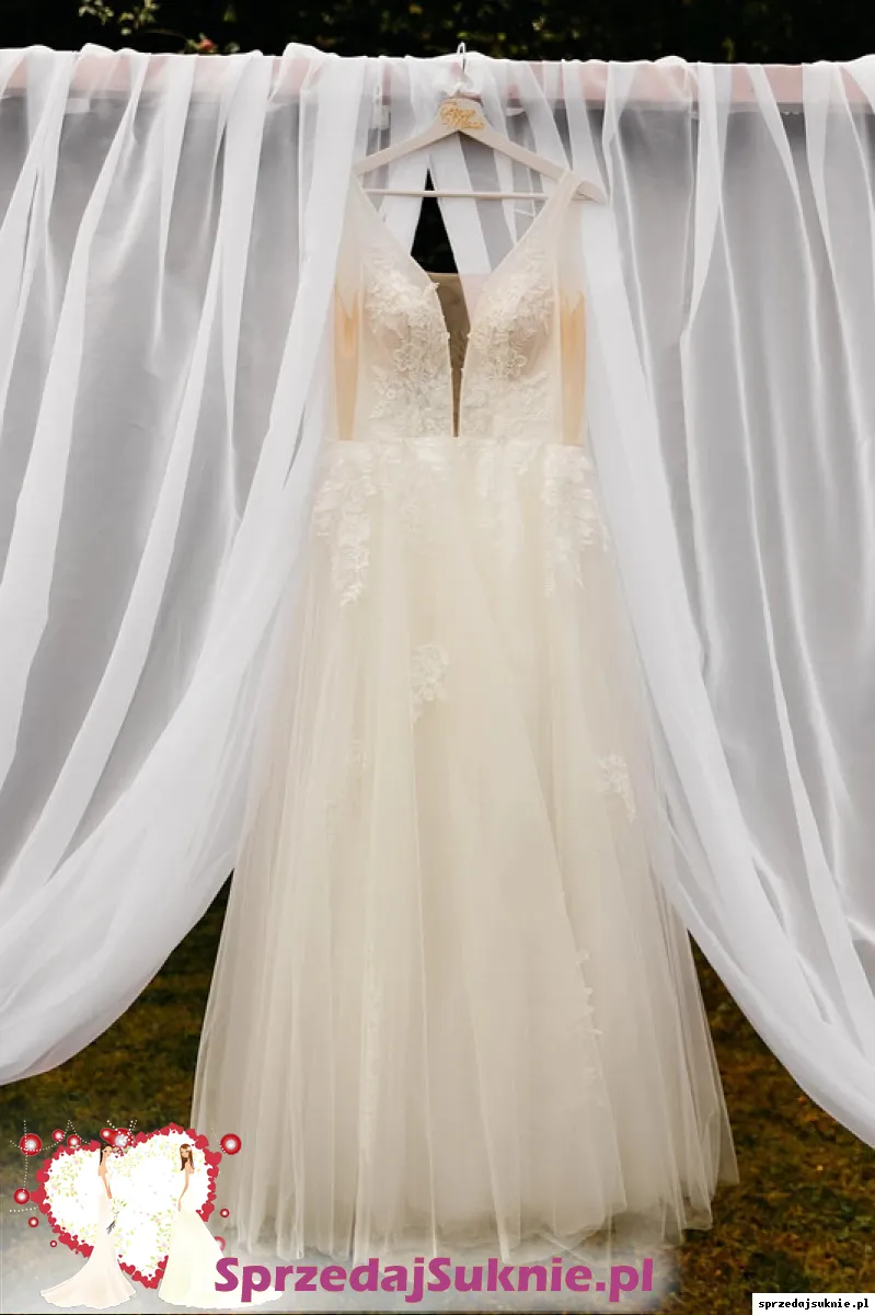 uknia jest w kolorze śmietankowym, wykończona delikatną koronką na górze sukni jak i na spódnicy.