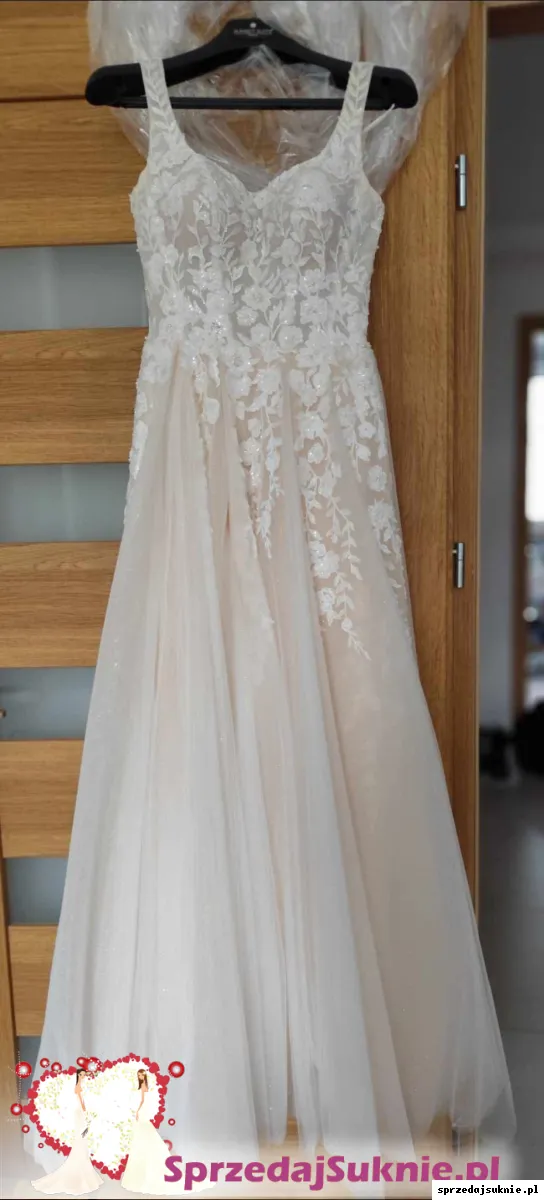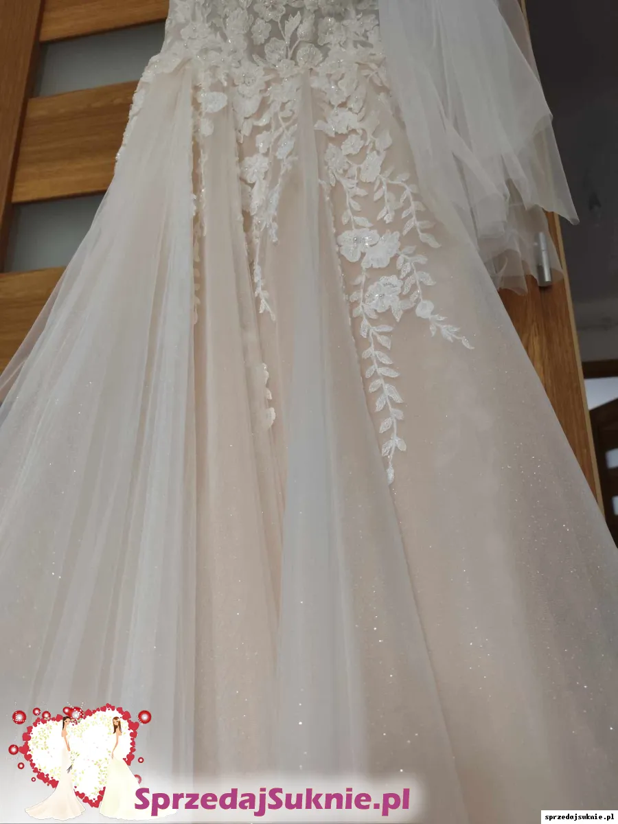 Sprzedam przepiękną suknię w delikatnym szampańskim odcieniu. Posiada nieoczywisty dekolt dla dziewczyny z mniejszym biustem lub po prostu nielubiącej „rozcięć do pępka”. Suknia jest lekka i bardzo wygodna, bez koła, ma rozcięcie na lewej nodze. Materiał sukni jest brokatowy i pięknie się mieni w tańcu. Stan idealny, była założona tylko raz – bez sesji w plenerze. Możliwość przymiarki w Świdniku.