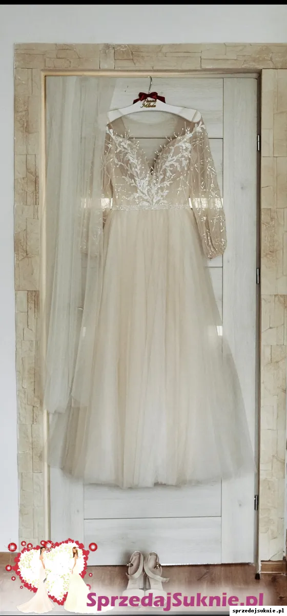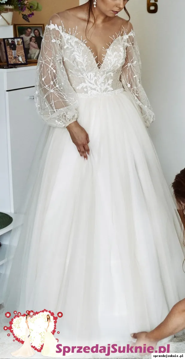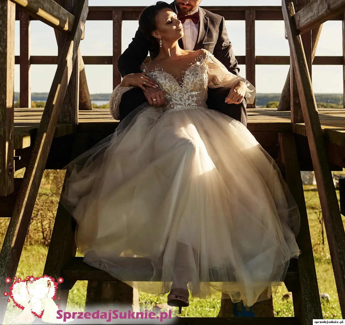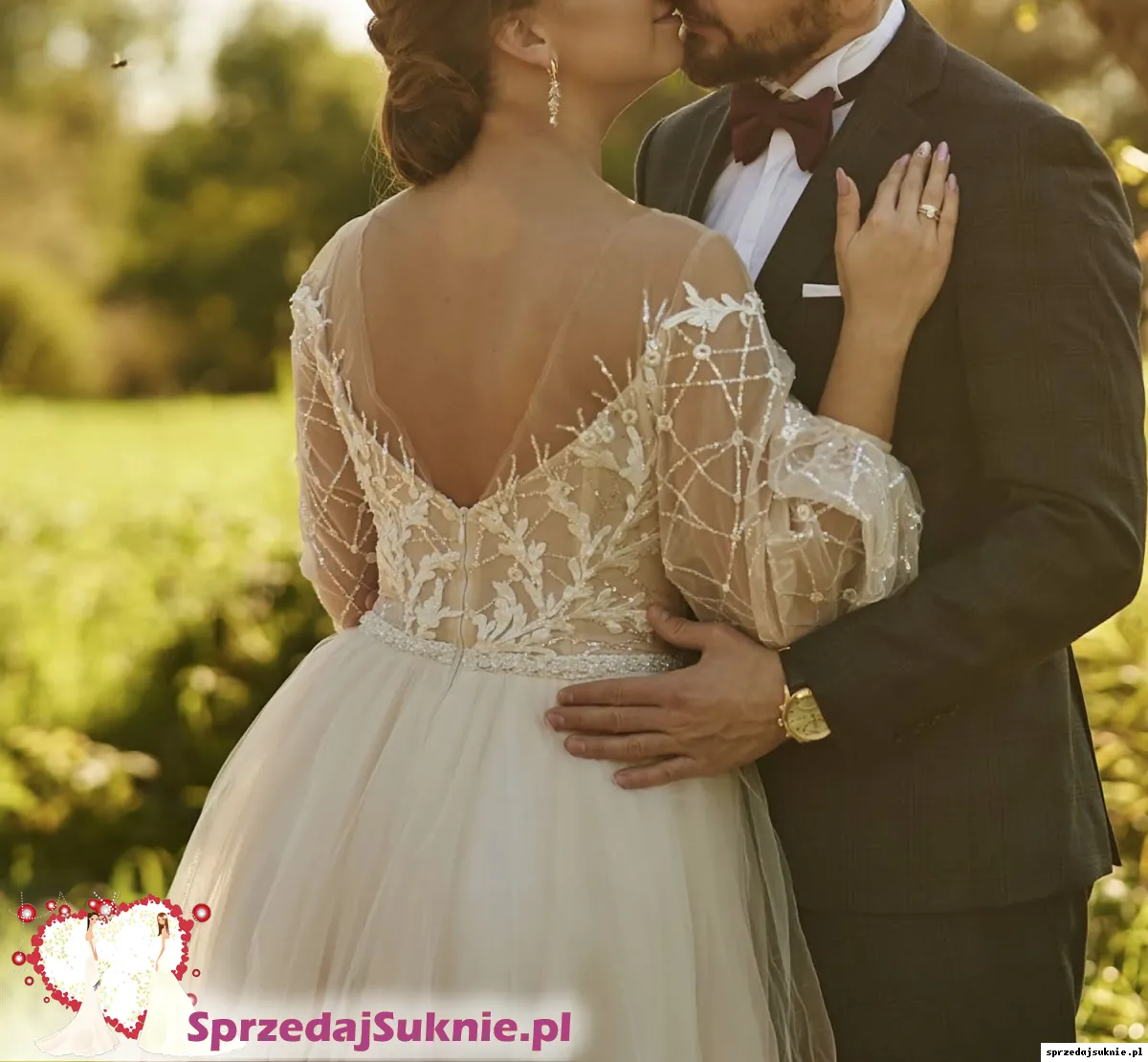 Sprzedam oryginalną suknie ślubną z modnymi bufiastymi rękawami. Suknia jest w ciepłym kolorku. Posiada piękne, bogate zdobienia zarówno na rękawach, jak i gorsecie. Zapinana na zamek. Rozmiar 36/38 na wysokość 163cm+6cm obcas. Suknia zakupiona w salonie Lipari za 4400 zł.