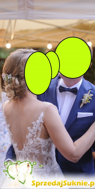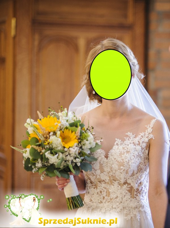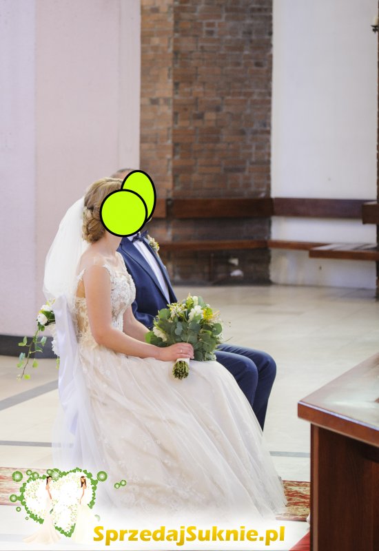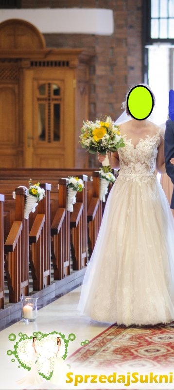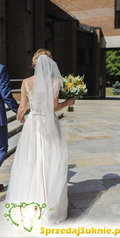 Sprzedam suknię ślubną w rozmiarze 38 (lekko zwężaną), na wzrost 169 cm + obcas 7 cm. Gorset sukni w kolorze nude lekko prześwitujący, z aplikacjami w kolorze śmietankowym. Posiada wbudowane miseczki, dzięki czemu nie wymaga założenia biustonosza. Posiada delikatne ramiączka z siateczki, również z aplikacjami. Plecy wycięte w literę V. Suknia posiada wiązanie ukryte pod perłowymi guziczkami, dzięki czemu można ją dopasować do sylwetki. Dół sukni posiada 3 warstwy, pierwsza to podszewka w jasnym kolorze, następna jest warstwa w kolorze kawy z mlekiem z delikatnymi zdobieniami wykonanymi z jasnej koronki (najbardziej zdobiony jest dół sukni). Wierzchnia warstwa to delikatny, zwiewny tiul w kolorze śmietankowym, przez który pięknie przebija się ciemniejsza warstwa. Całość dopełnia kokarda w kolorze beżowym, która dodaje sukni dziewczęcości. Suknia jest niezwykle lekka, wygodna, a dzięki gorsetowi wszystko trzyma się na swoim miejscu. Do sukni dorzucę halkę z dodatkową warstwą tiulu i wyjmowanym kołem. Dzięki niemu suknia zyskuje większą objętość i rozłożystość, w zależności od tego, jaki efekt chcemy uzyskać. Dorzucę również pasujący welon, o długości do pleców, gładki z obszytymi błyszczącymi koralikami końcami. Suknia wymaga delikatnego czyszczenia. Jest delikatnie przybrudzona na dole, na tiulu jest parę małych zaciągnięć (ale nie dziur), ale jest to niemal niezauważalne. Nie posiada innych zniszczeń. Suknia była założona na ślub oraz parogodzinne przyjęcie, nie całonocne wesele. Jej stan oceniam na bardzo dobry +, niemal idealny. Możliwość umówienia się na przymiarkę w Warszawie lub wysyłki sukni. Cena do negocjacji