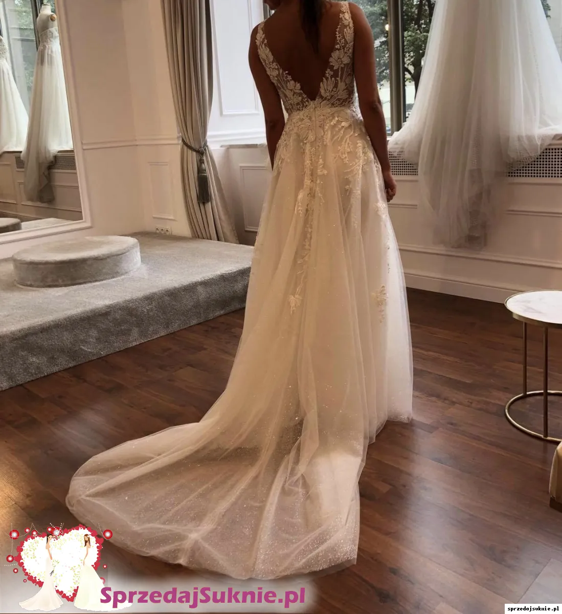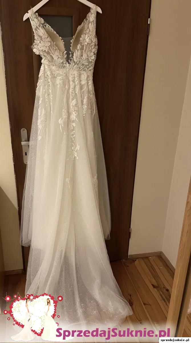 Suknia posiada efektowny podpinany tren , ponieważ z tyłu sukni znajdują się dwa przezroczyste zatrzaski.