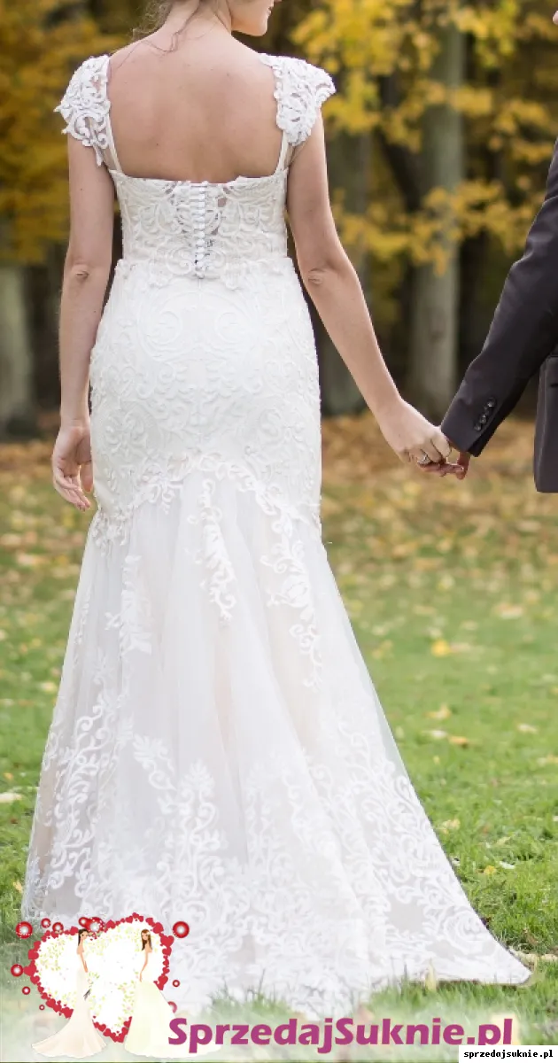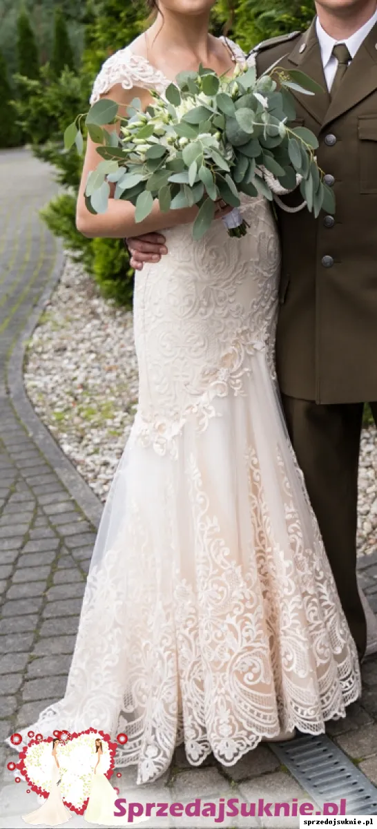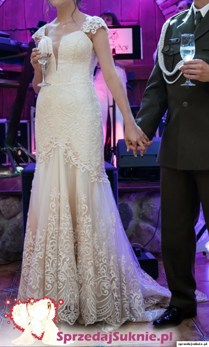 Sprzedam suknię ślubną z indywidualnego projektu, uszyta przy wsparciu marki Hadassa. Suknia o kroju syrenki z gorsetem i podpinanym trenem. Posiada usztywnione miseczki i pięknie wycięty dekolt. Kolor szampan z bielą, dół mieni się w kolorach ombre (odcienie bieli, beżu i złota). Suknia przepięknie prezentuje się w świetle dziennym. Zdjęcia niestety nie oddają tego jak suknia wygląda na żywo. Rozmiar bym określiła jako małe M bądź S ( pierwotnie miała rozmiar M, ale została sporo zwężona). Suknia na wzrost 164, buty 6 cm. Zapraszam na przymiarki.