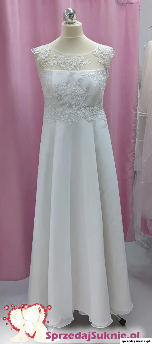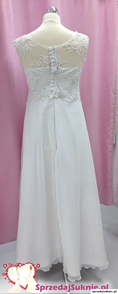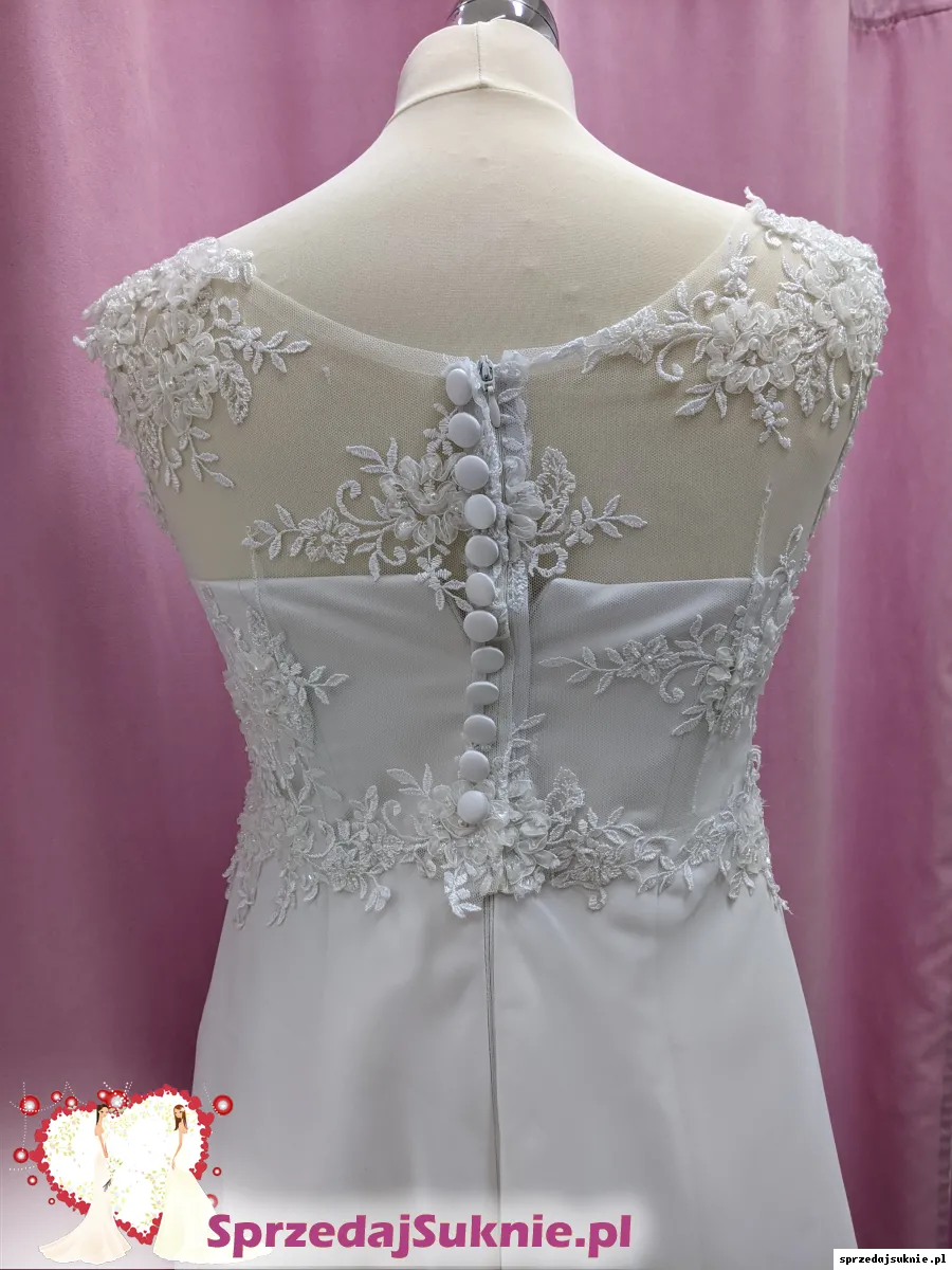 Piękna, modna i elegancka suknia ślubna polskiej firmy Kaprys. Jest jednoczęściowa, z satyny, odcinana pod biustem. Dół jest z szyfonu, a góra zabudowana koronką. Zapina się ją suwakiem, wykończona jest guzikami. Jest bez koła, ale posiada tunel na koło.