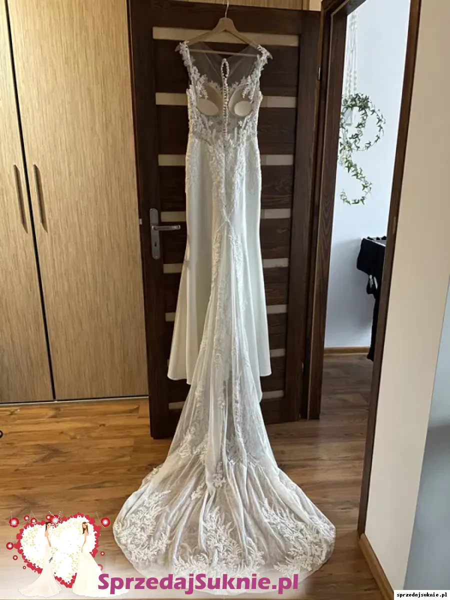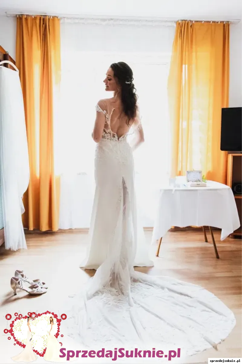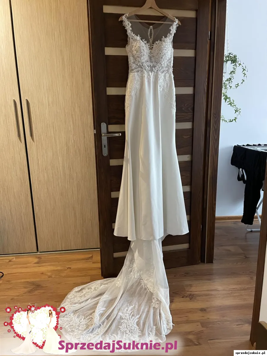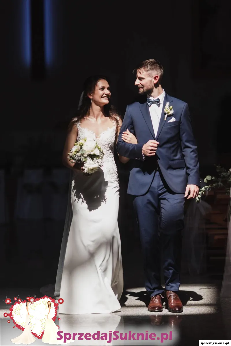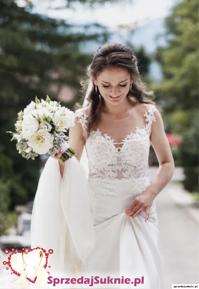Przyszła Panno Młoda, posiadam na sprzedaż wspaniałą suknię ślubną, dzięki której olśnisz wszystkich gości w tym wyjątkowym dniu. Suknia wybrana z prestiżowej kolekcji w salonie sukni ślubnych Avenue 22 w Krakowie. Suknia w kroju rybki, mimo wątpliwości okazała się bardzo wygodna w tańcu. Szyta na miarę jest najbliższa rozmiarowi 36. Uszyta jest na Pannę Młodą o wzroście 170 cm noszącą buty z obcasem 8 cm. Obwód w biuście : 88cm Obwód pod biustem : 80cm Obwód w talii : 76cm Obwód w biodrach/pośladki : 96cm Suknia w kolorze bieli przechodzącej w ecru. Posiada długi tren z przeziernego materiału wyszywanego oszałamiającą koronką i kryształkami. Tren schodzi się pod pośladkami formując pięknie prezentujący się klin. Na wykończeniu trenu wszyte są dwa guziczki na dwóch różnych wysokościach - jeden do podpięcia trenu na pełną długość, drugi umieszczony wyżej utrzymujący tren lekko nad parkietem, bardzo pomocny w pierwszym tańcu. Góra sukni jak i plecy pokryte są delikatną siateczką niewidoczną na zdjęciach, która z tyłu łączy się rzędem guzików, a z przodu podtrzymuje spływającą z ramion koronkę. W suknie wszyte są miseczki i dodatkowy push up, który w razie potrzeby może zostać odpruty. Brak jakichkolwiek uszkodzeń najlepiej świadczy o jakości użytych materiałów. Dół sukni, ani podszewka nie jest zniszczona czy poplamiona. Suknia została wyczyszczona po uroczystości przez profesjonalny serwis współpracujący z salonem, w którym została zakupiona. W tej chwili prezentuje się jak nowa. Posiadam też oryginalny pokrowiec, który załączam do zakupu. GRATIS długi welon katedralny, 3 metrowy, wykończony kołem, z tiulu muślinowego w kolorze ecru, dobrze komponujący się z kolorem sukni! Serdecznie zapraszam na przymiarki w Krakowie!
