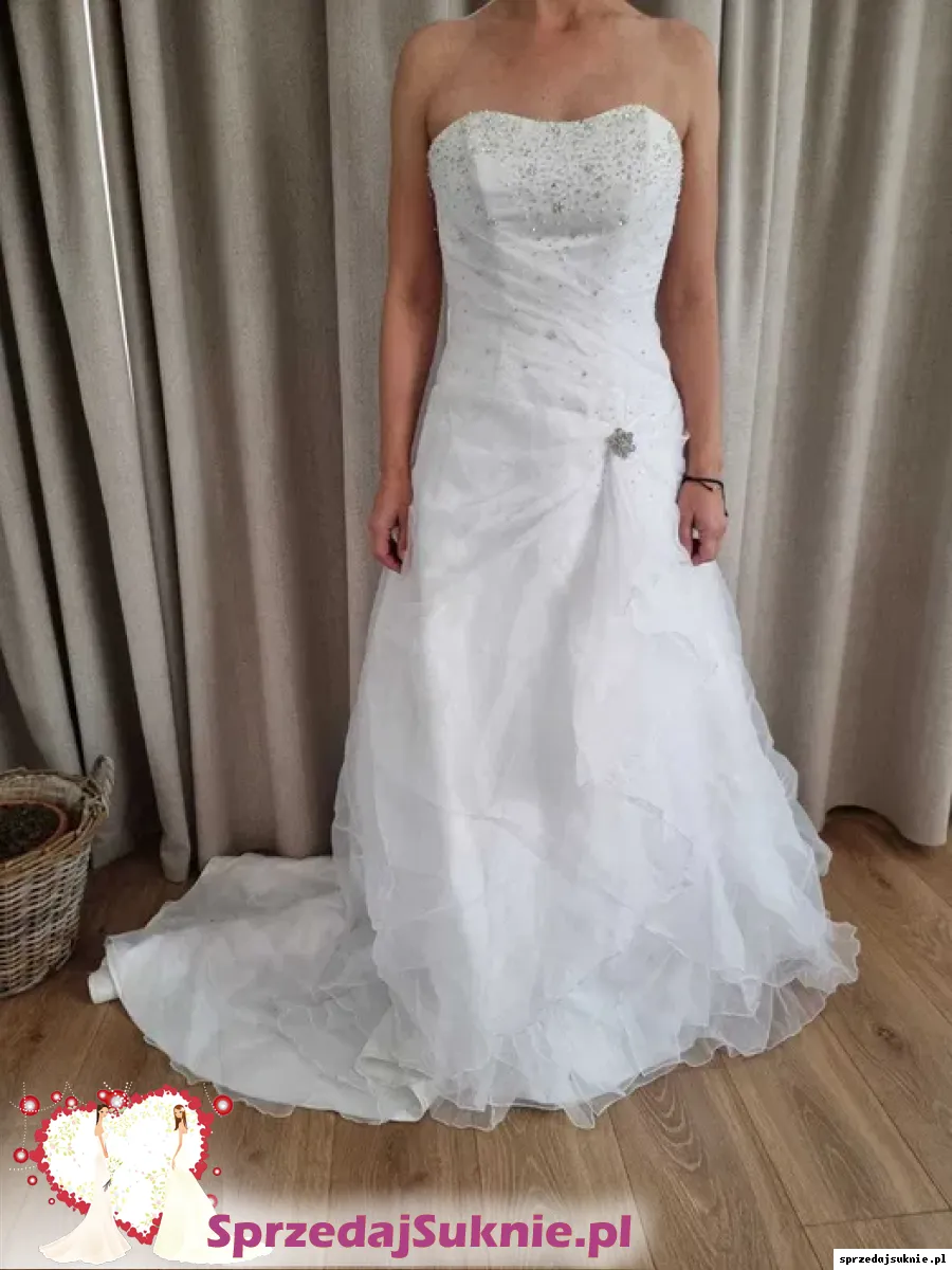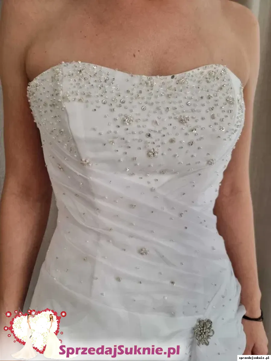 Wyjątkowa suknia ślubna z Włoch w kolorze białym. Dodatkowo do zestawu wchodzi wianek i rękawiczki. Idealna propozycja dla wymagającej kobiety, która pragnie wyglądać olśniewająco w tym wyjątkowym dniu. Suknia ma delikatne plamki na dole z lewego boku, które są ledwo widoczne na żywo oraz brakuje jej kilku cekinów na biuście. Wszystko ujęte na załączonych zdjęciach.