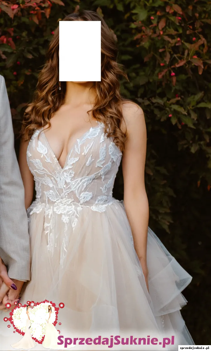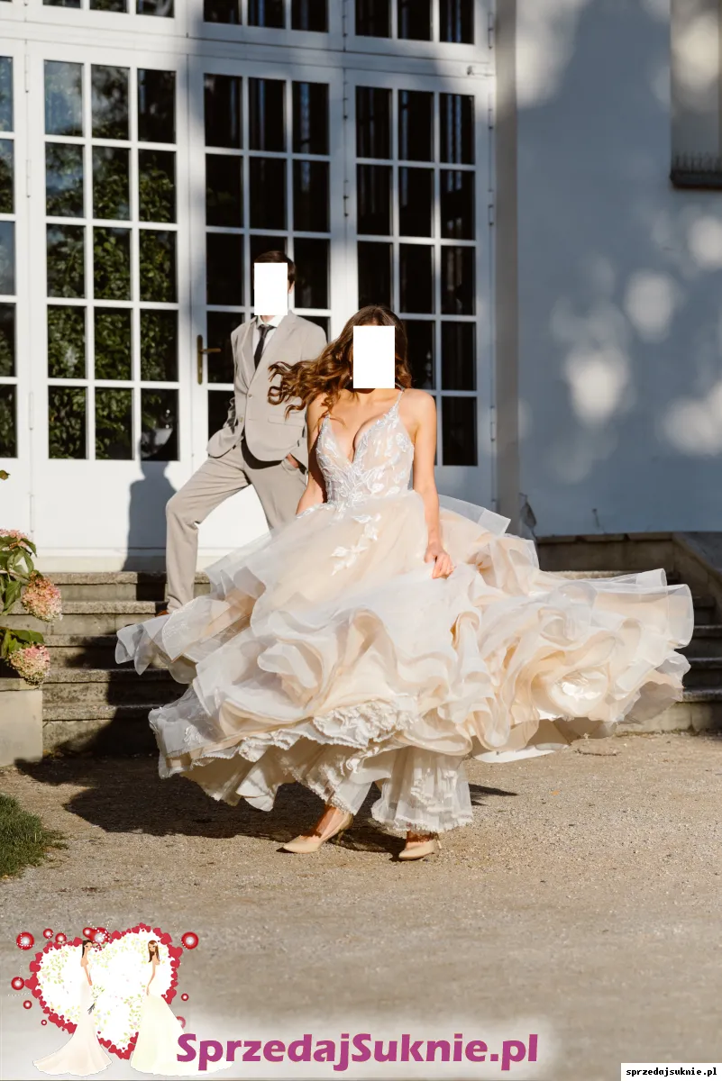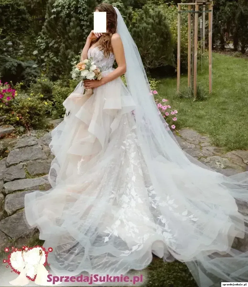 Stan: suknia założona w dniu ślubu i na sesję plenerową, posiada normalne ślady użytkowania - warstwy tiulu mogą mieć pojedyncze zaciągnięcia lub rozdarcia na dole sukni do zacerowania/ ścięcia. Po praniu chemicznym.