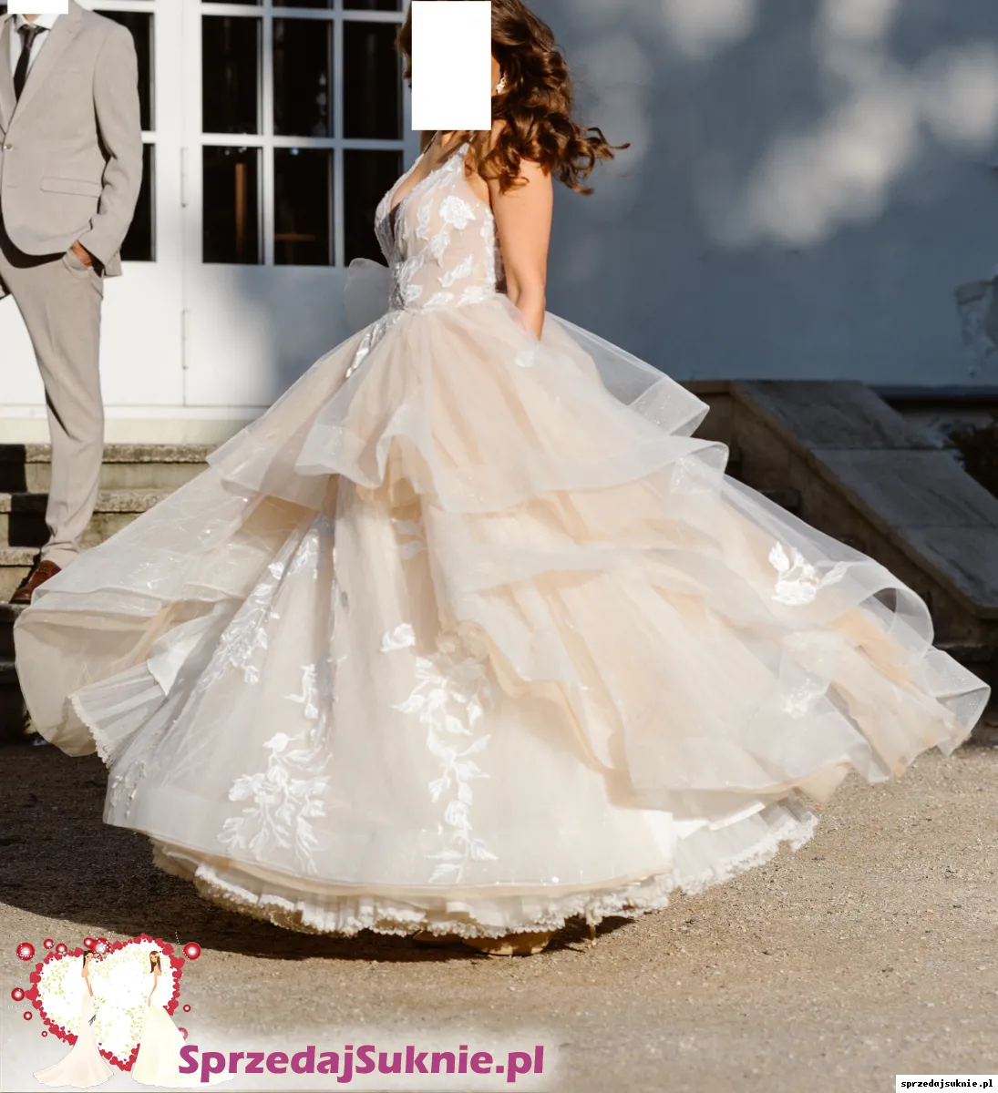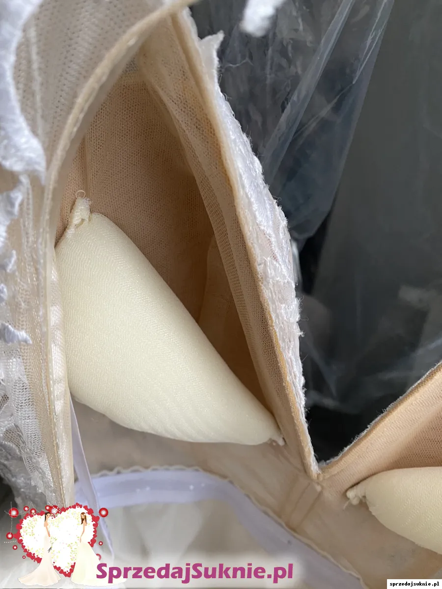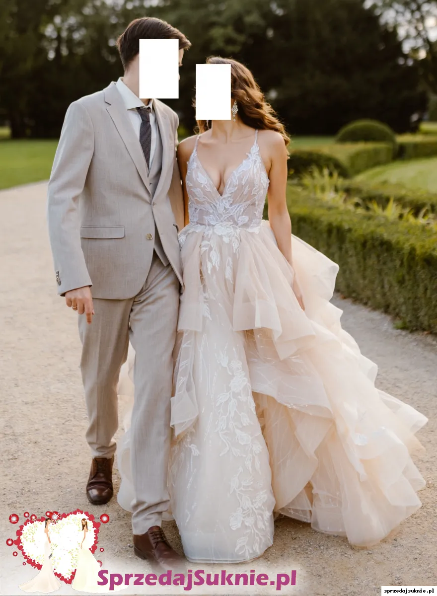 Stan: suknia założona w dniu ślubu i na sesję plenerową, posiada normalne ślady użytkowania - warstwy tiulu mogą mieć pojedyncze zaciągnięcia lub rozdarcia na dole sukni do zacerowania/ ścięcia. Po praniu chemicznym.