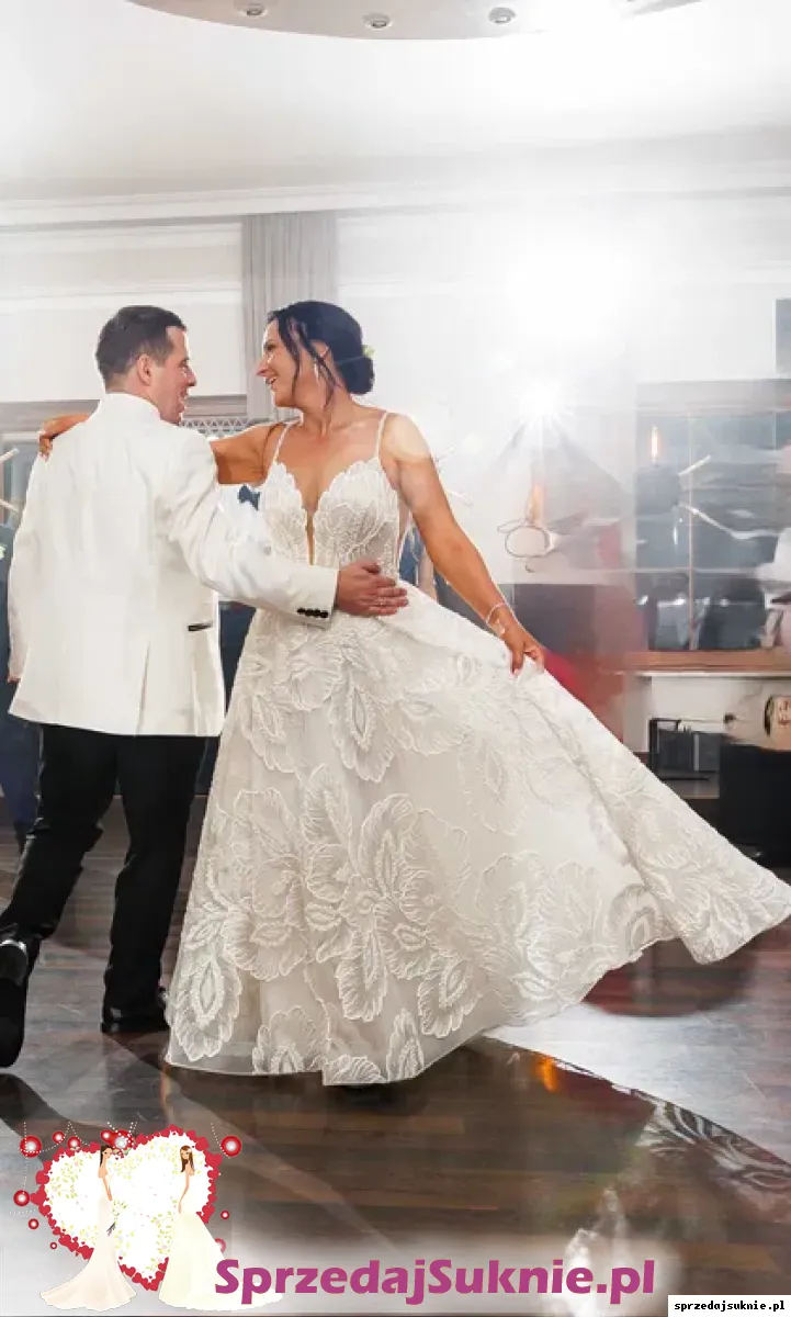 Cała w trójwymiarowej koronce, wzór kwiatów wykonany srebrnym brokatem, który sprawia, że suknia pięknie się mieni.
