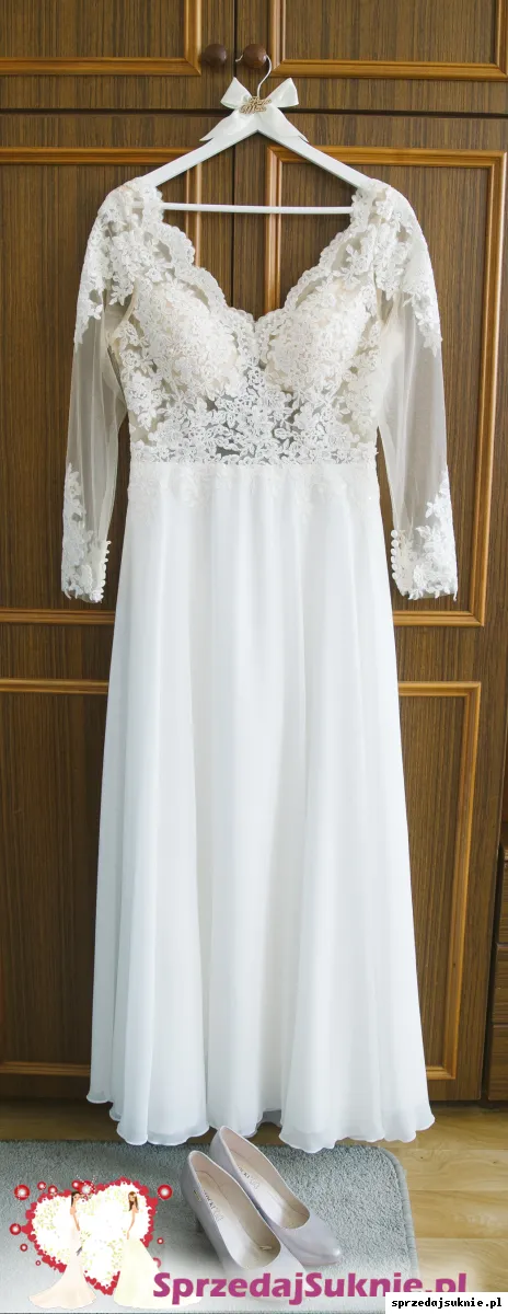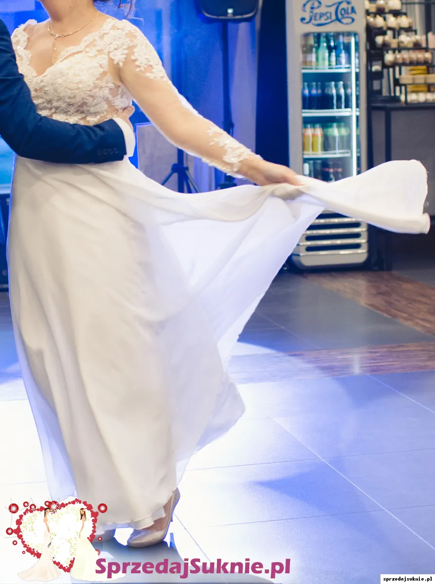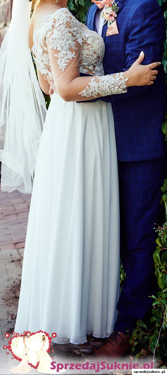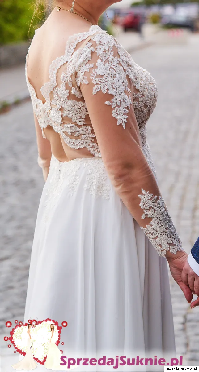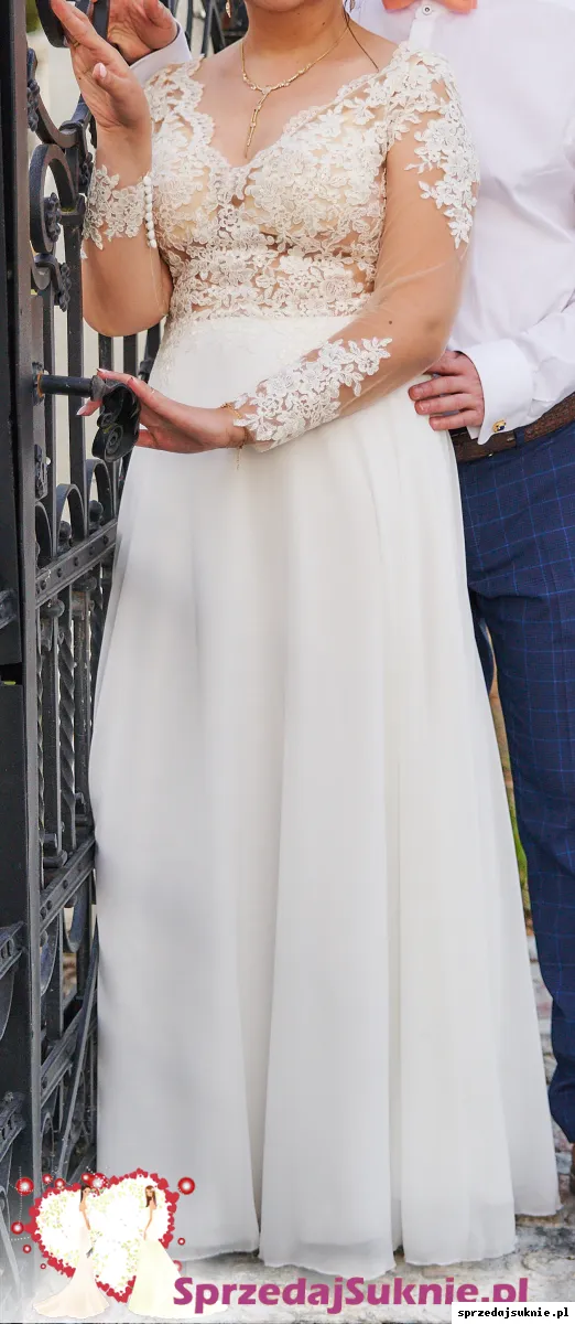 Kolor Ivory - kość słoniowa Rozmiar L przybliżone wymiary ciała: biust: 98-102, talia 80-84, biodra 106-110 (+/-2cm) Góra z koronki delikatnie rozciągliwej, przezroczystej, wszyte miseczki, zapięcia na haftki i guziczki, dolna część sukni delikatnie rozszerzana, wykończona ozdobną lamówką, z tkaniny szyfonowej na podszewce z połyskiem. Serdecznie zapraszam do korespondencji w sprawie kupna.