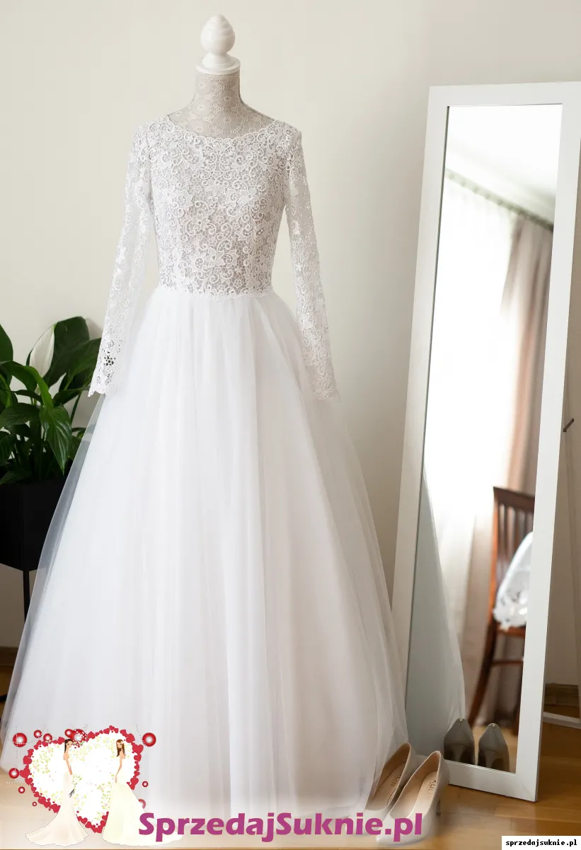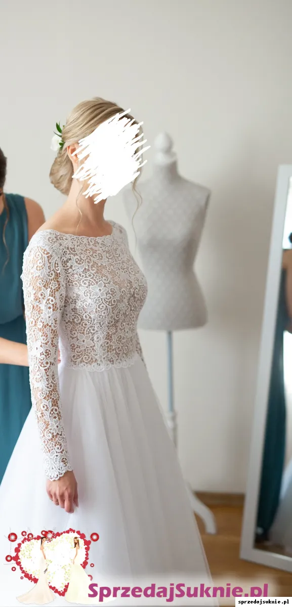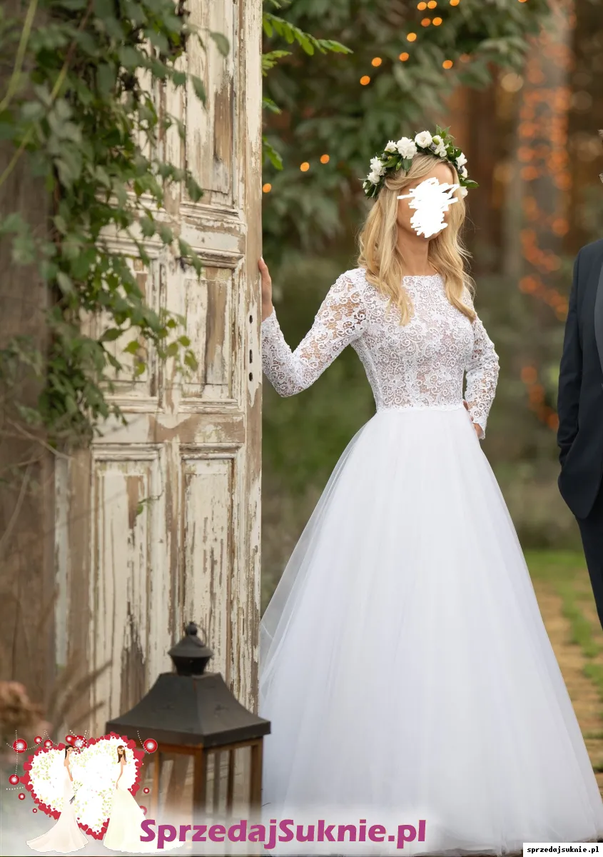 Sprzedam suknię ślubną. Koronkowa góra z długim rękawem i gładki dół. Rozmiar 34, wzrost 162 i 7 cm obcas. Możliwość negocjacji ceny. Możliwość przymiarki. Suknia bardzo wygodna i elegancka. Posiadam również welon. Jest to przerobiony model 1909, gdyż oryginał posiada zakryte plecy.