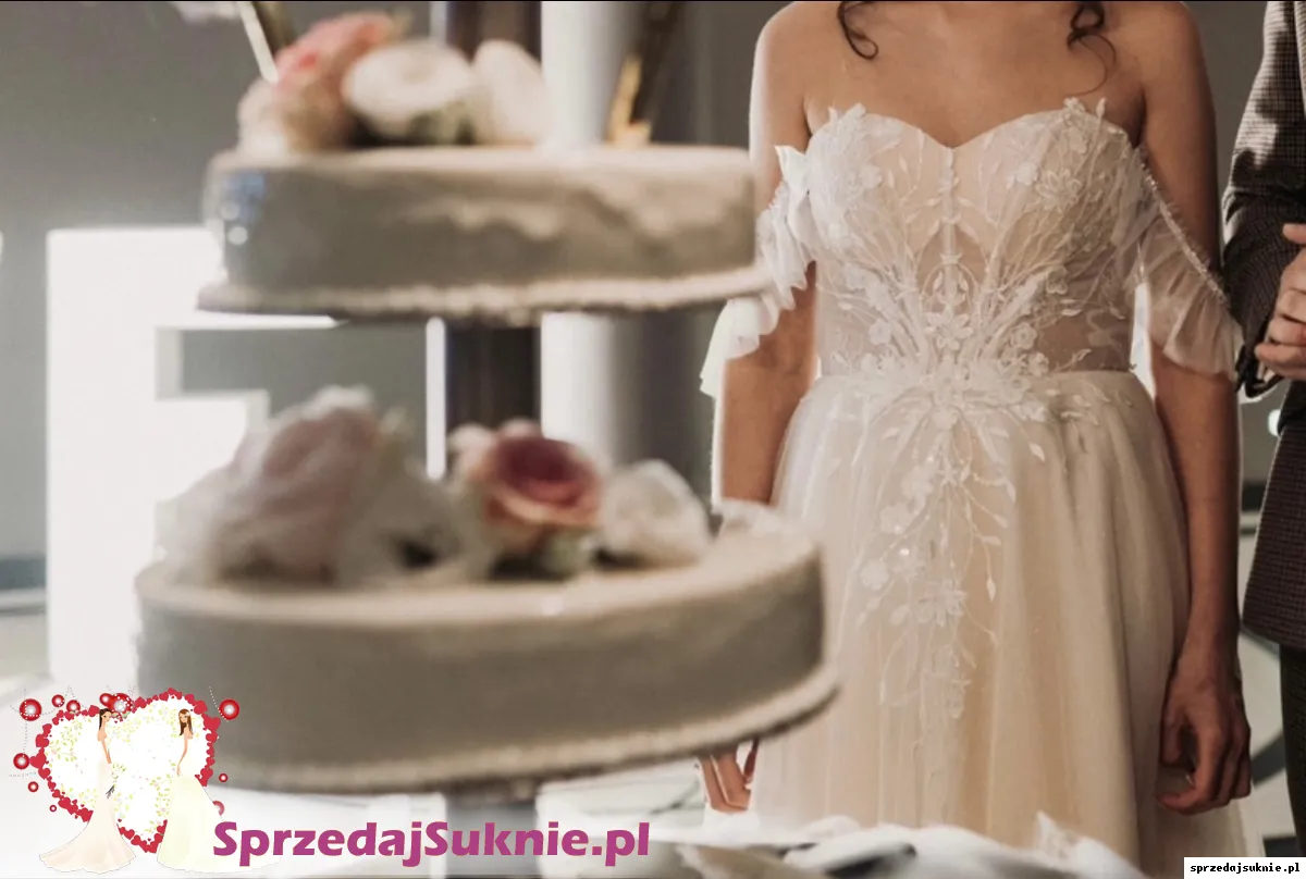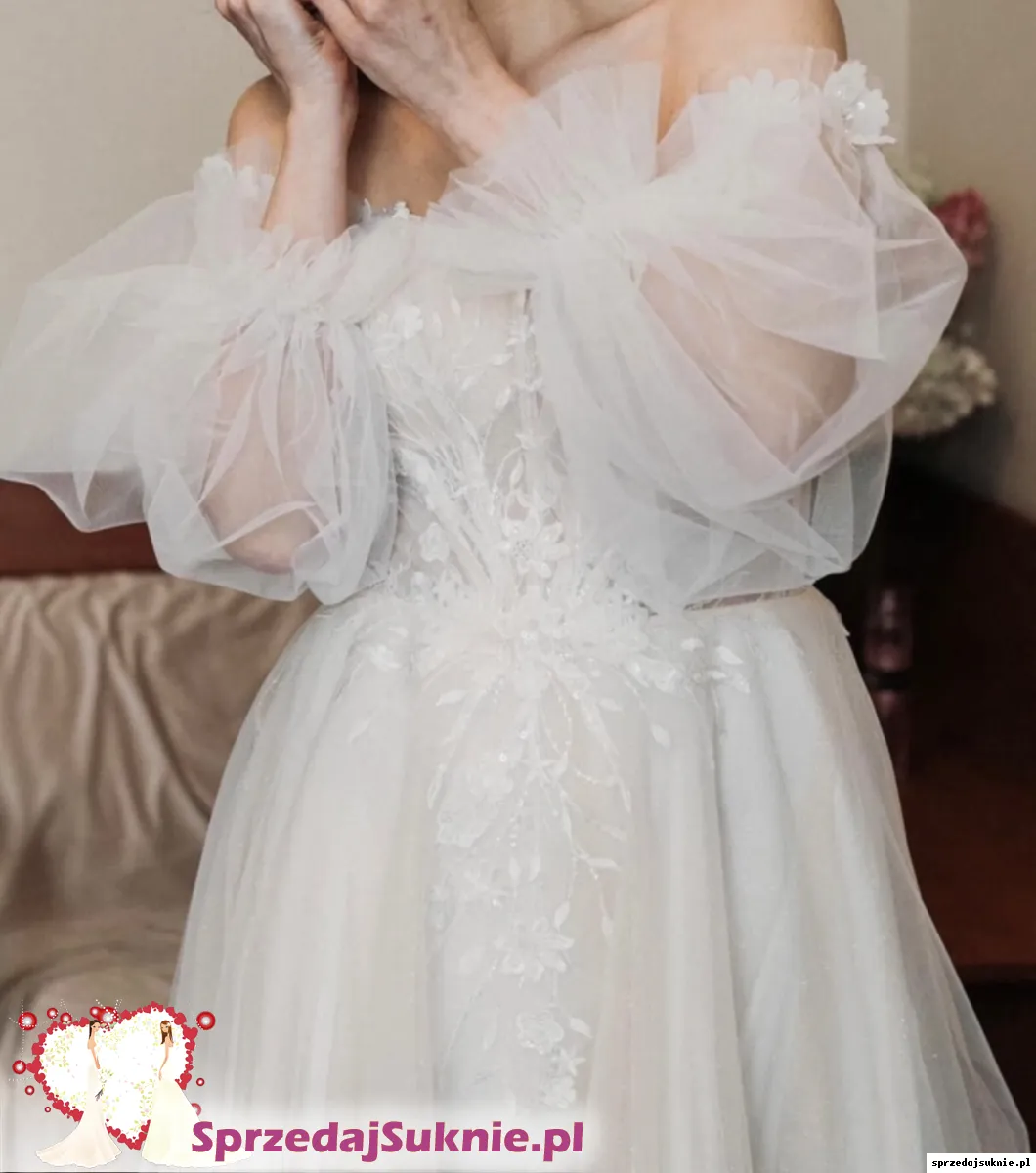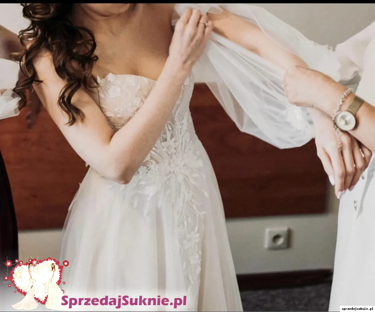 Starannie zaprojektowana i wykonana. O rozmiarze 34, szyta na długość 158 cm (+7,5 cm obcas). Suknia była założona dwa razy: w dniu ślubu oraz sesji plenerowej. W zestawie są rękawki oraz doczepiane paseczki. Suknia została już wyprana.