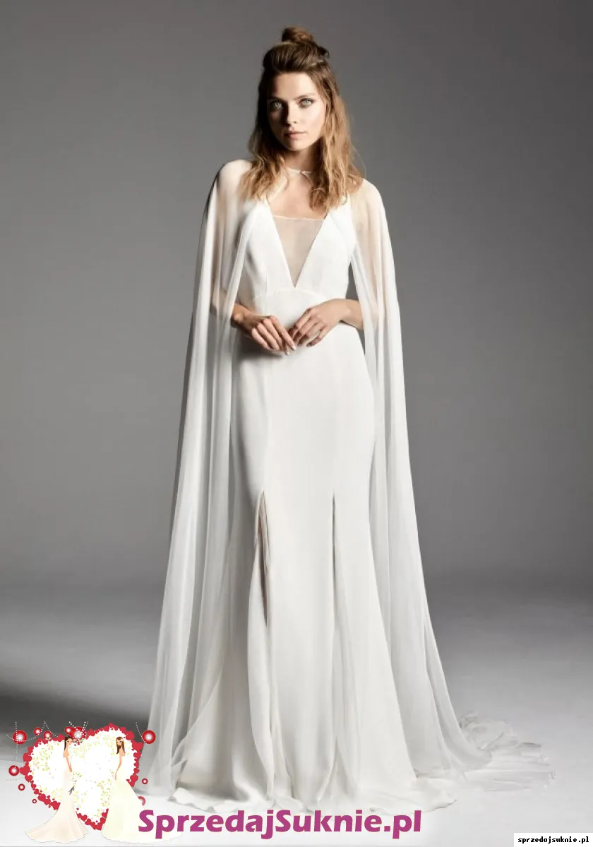Za艂膮czone zdj臋cia katalogowe prezentuj膮 sukni臋 z peleryn膮,