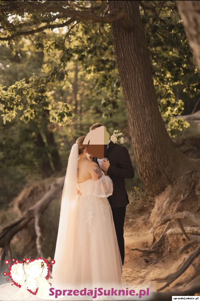 Sprzedam suknię ślubną firma Agnes model 20 313 bez trenu. Ubrana w dzień ślubu i na sesję poślubną. Została oddana do pralni. W paru miejscach należy przyszyć koraliki, w spódnicy kilka zaciągnięć i znalazłam jedna dziurkę - uszkodzenia nie są widoczne. Druga warstwa tiulu brokatowa. Suknia szyta na miarę, ale myślę, że na spokojnie nada się dla rozmiaru od 40 do 44.