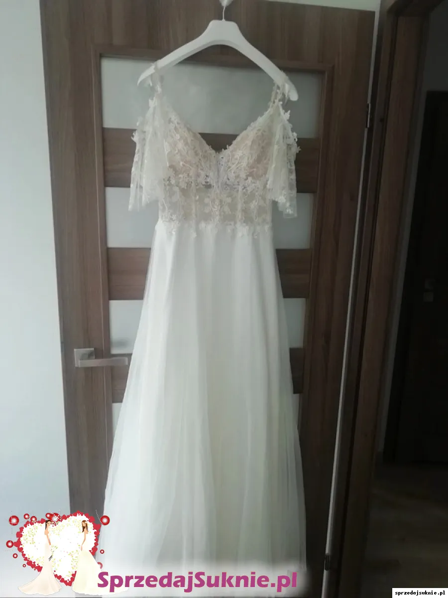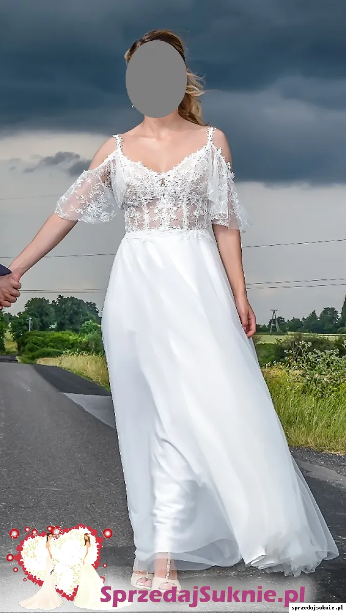 Sprzedam moją suknię ślubną, szytą na miarę w kolorze kremowym. U góry prześwitująca delikatnie koronka, dół muślinowy. Spódnica świetnie obraca się w tańcu. Cała sukienka mega wygodna i robiącą wrażenie. Nietypowe rękawki a'la hiszpanka.