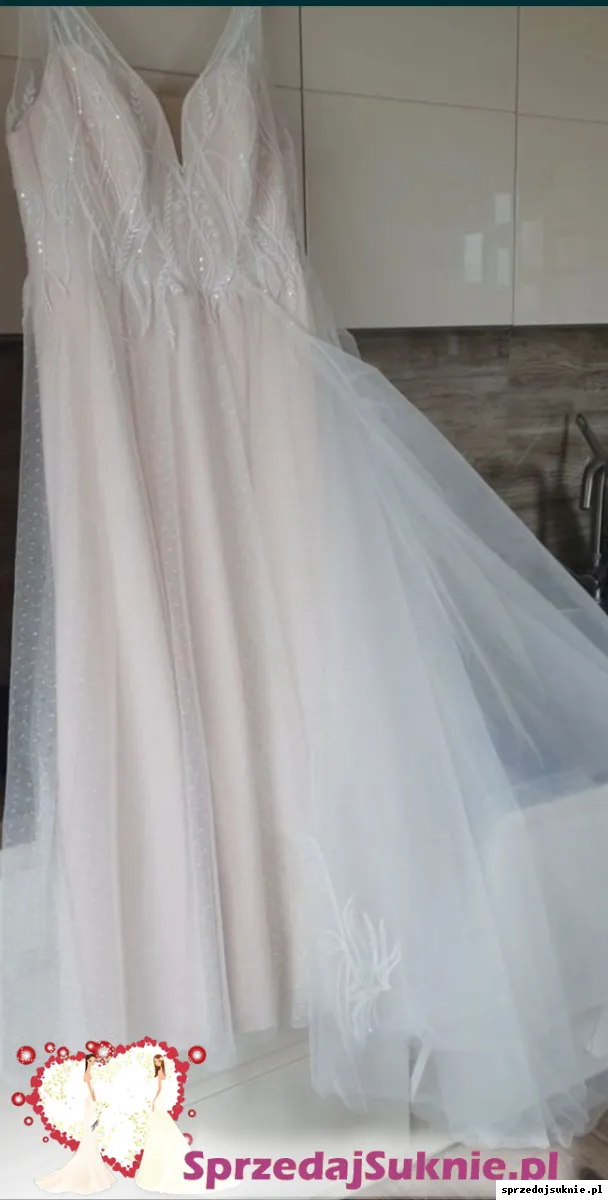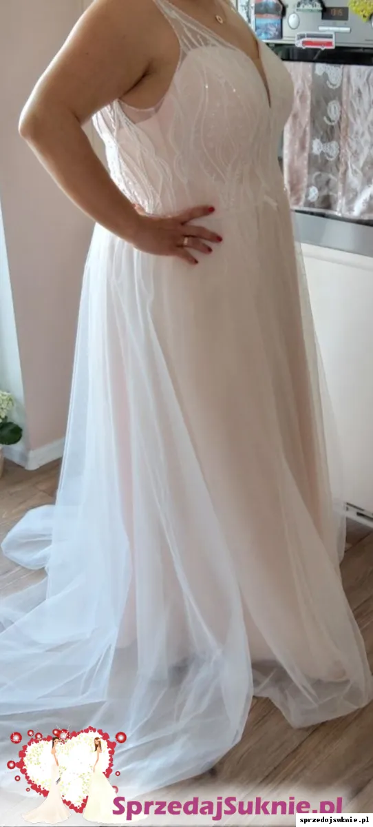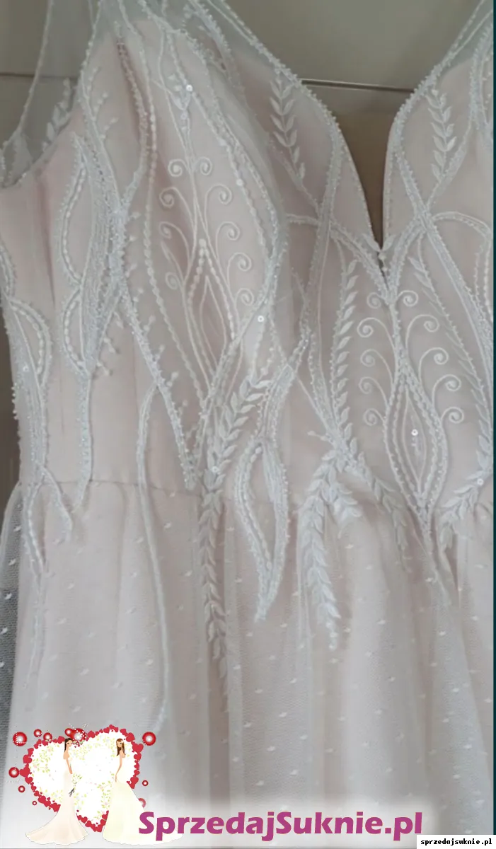 Gorset jest wyszywany cały z włoskiej bardzo drogiej koronki mieniącej się w ruchu - sukienka ma ręcznie wyszywane perłowe koraliki na koronce oraz na całej linii dekoltu z przodu i z tyłu. Dodatkowo na koronce na haftach są przejrzyste cekiny, które właśnie się mienią. Koronka na żywo dużo efektowniejsza.