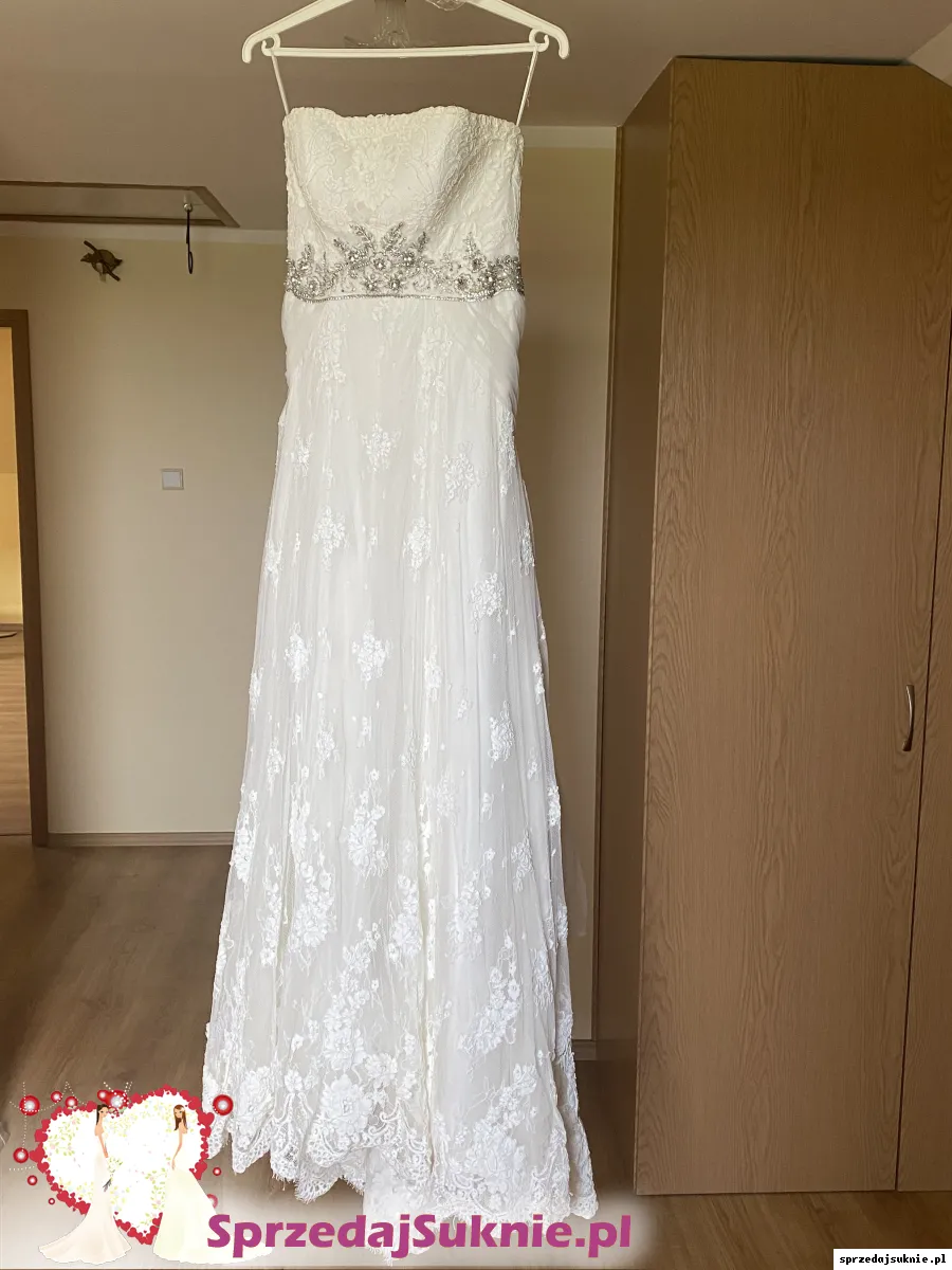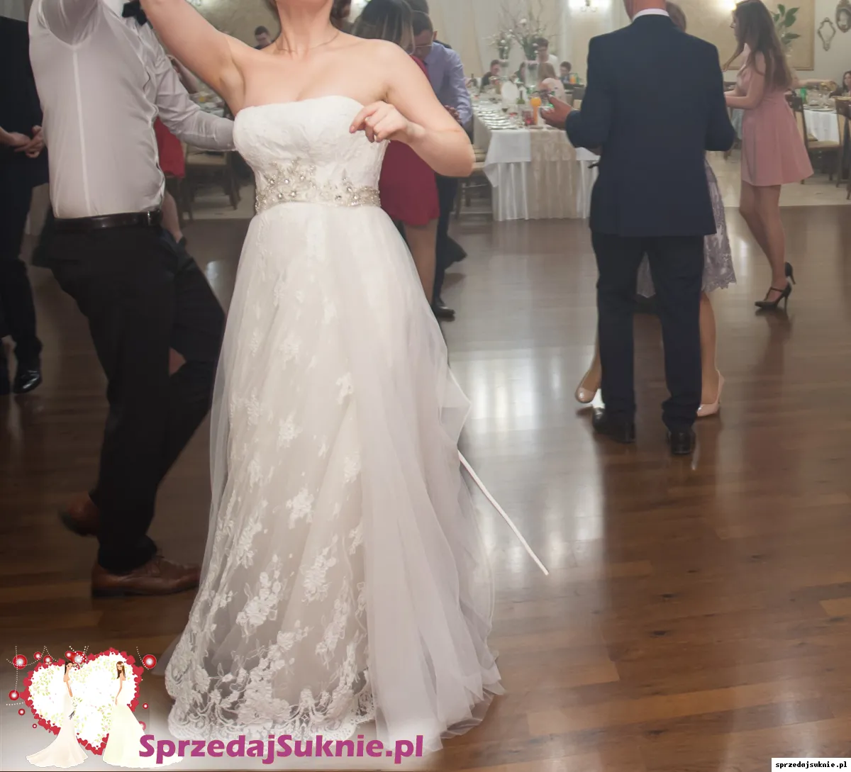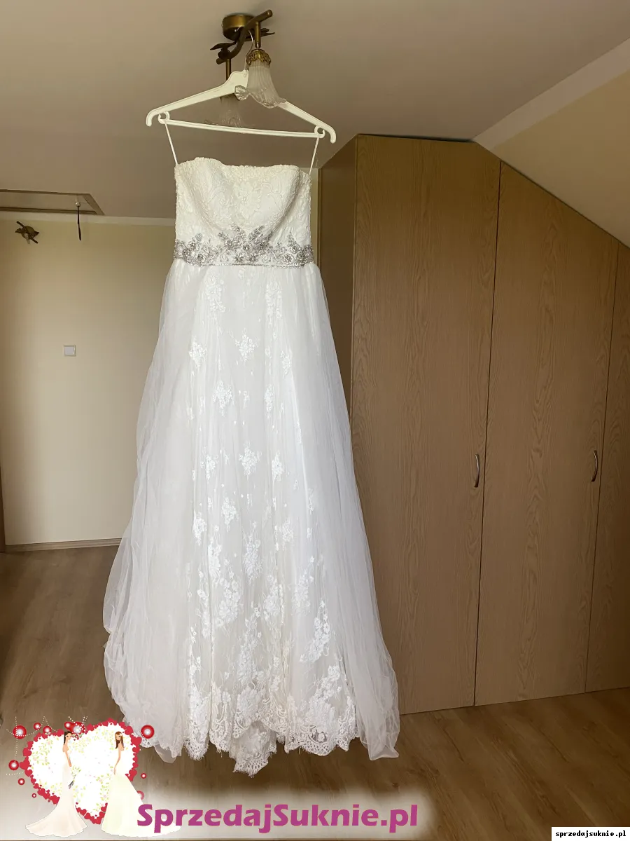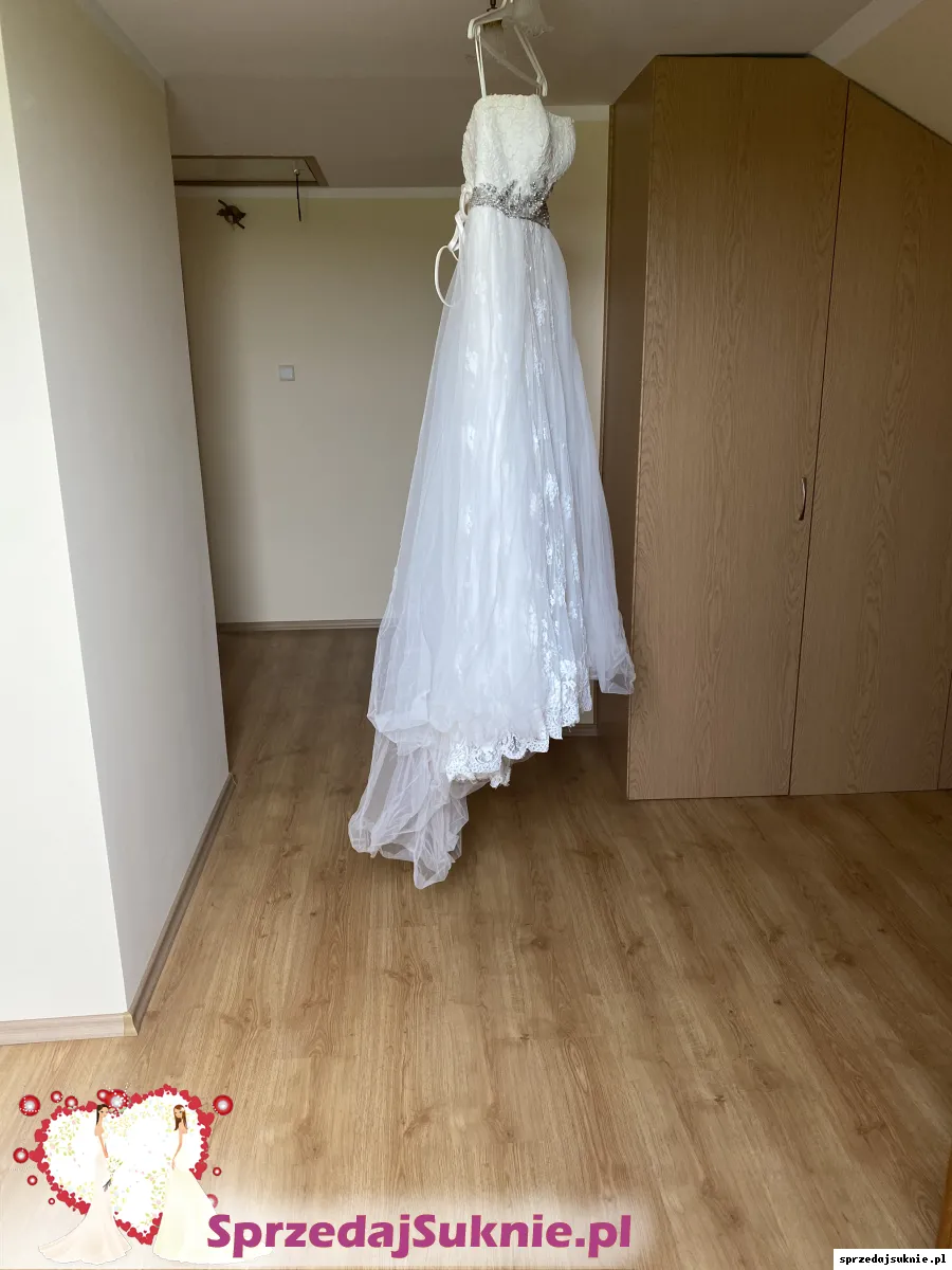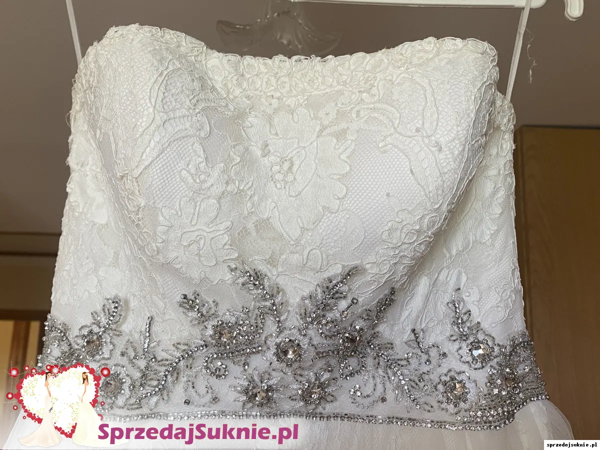 Suknia koronkowa zdobiona w pasie błyszczącą aplikacją. Posiada odpinany tren. Po bokach posiada podwójną warstwę tiulu, która można spokojnie zlikwidować. Nie posiada wszytych miseczek, z tyłu wiązana. Dobra do miseczki max C/D. Suknia u dołu na podszewce w jednym miejscu ma rozdarcie. Suknia wyprana.