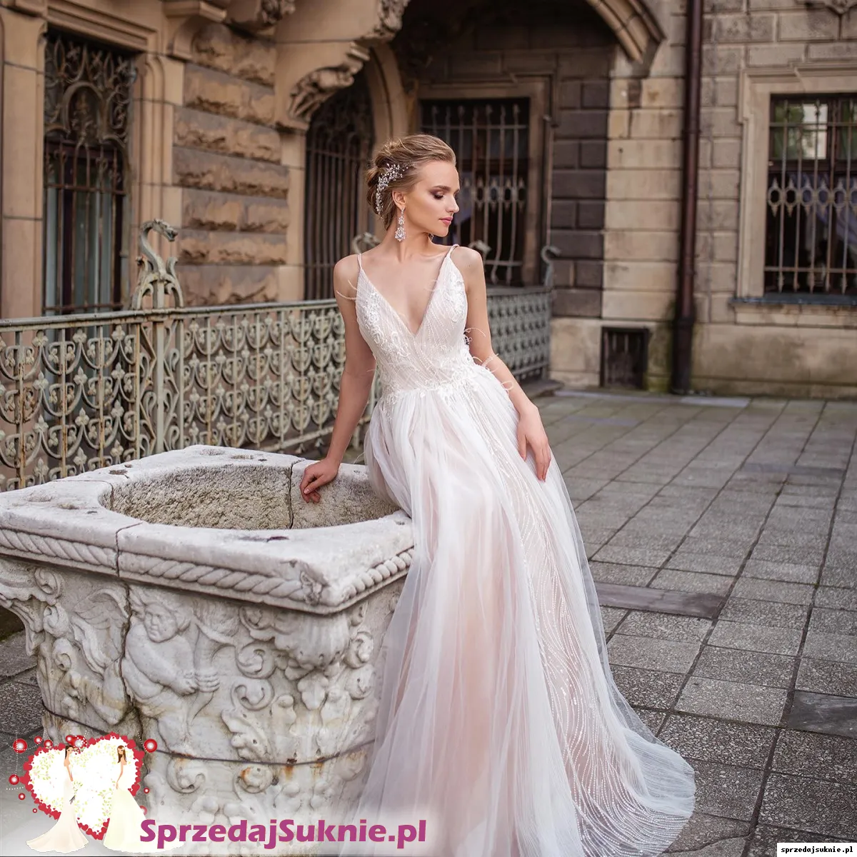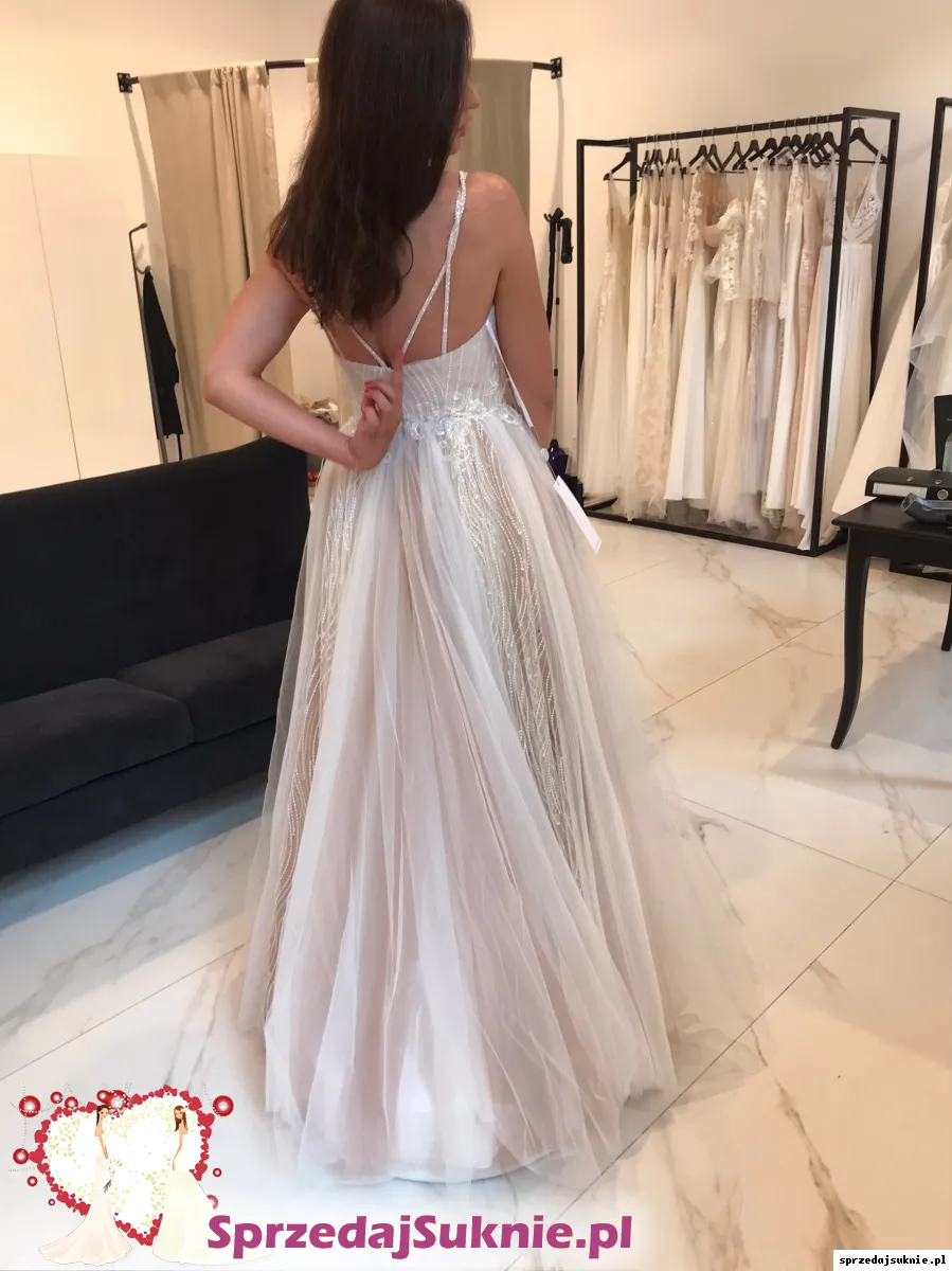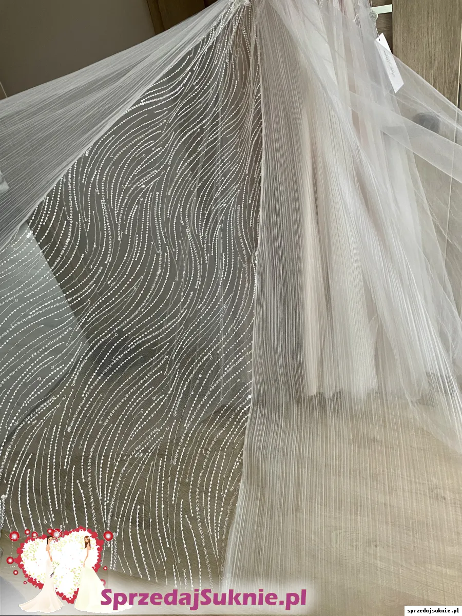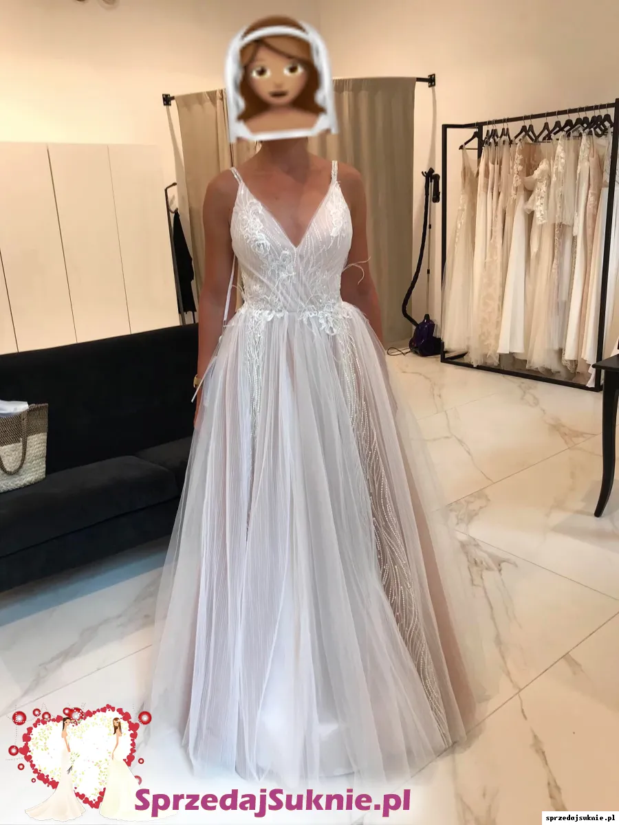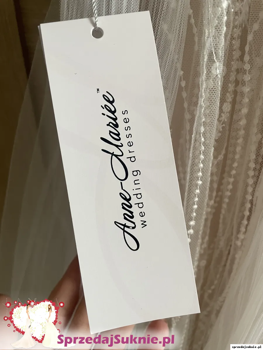 Nowa suknia Anne Marie model Caprice. Kupiona w salonie Sandre Wedding Studio we Wrocławiu. Model z kolekcji 2020, sprawy tak się potoczyły, że przeleżała w pokrowcu. Mierzona tylko podczas odbioru z salonu. Szyta ze standardowego rozmiaru 38 na wzrost 170 + obcas (nie była poddana obróbce krawieckiej po odbiorze, więc posiada „oryginalny” naddatek do skrócenia). W porównaniu do modelu katalogowego gorset na plecach jest dłuższy o ~5cm. Ramiączka wysadzane kryształkami, w talii przyozdobiona piórkami i cyrkoniami. 3 warstwy tiulu (pierwsza biała z 3 różnych wzorów, dwie kolejne brudny róż) + 2 warstwy białej halki.