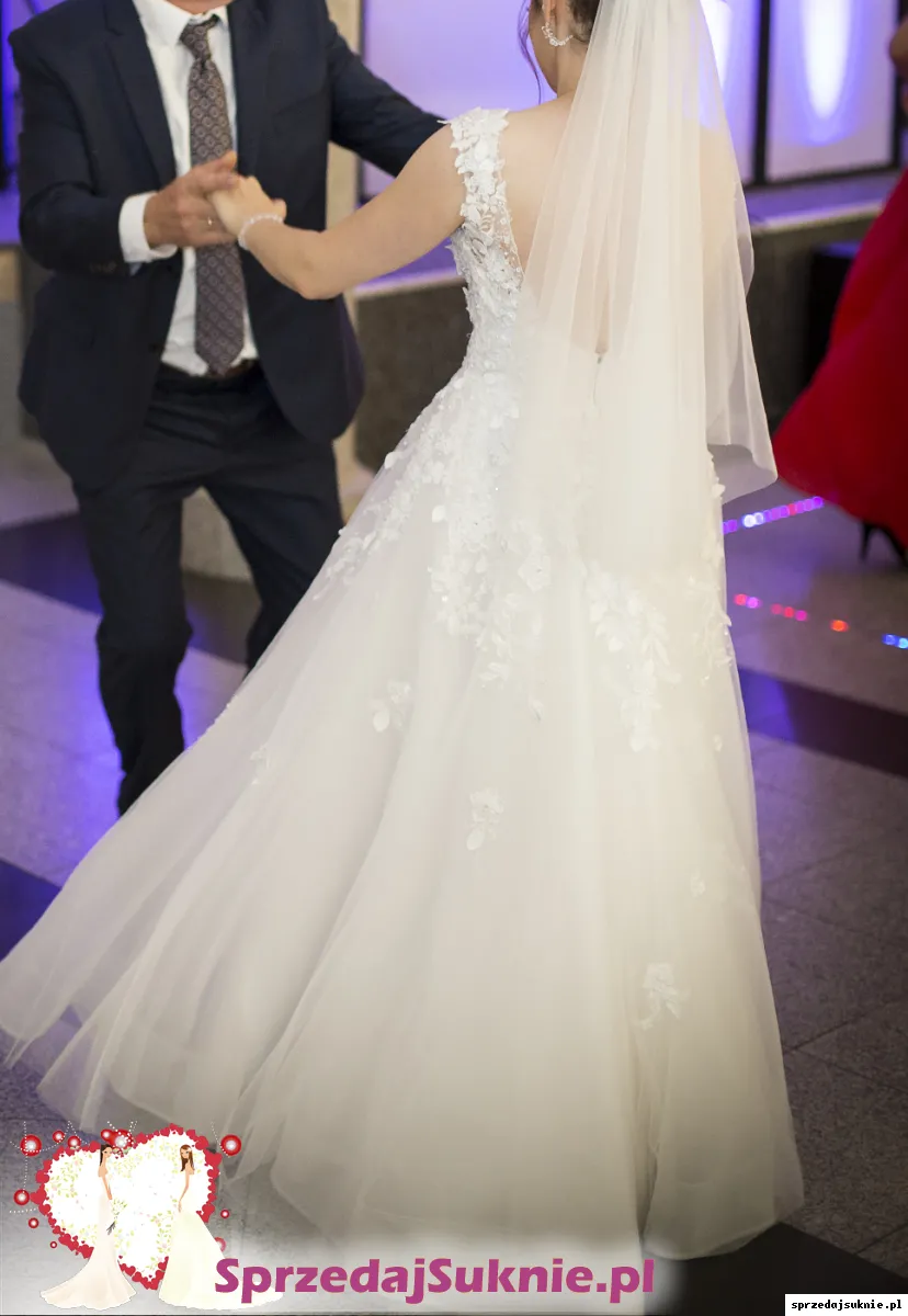 Sprzedam zjawiskową, włoską suknię ślubną Demetrois 200109 zakupioną w 2021r. w salonie sukien ślubnych Madleine w Poznaniu. Jestem jej pierwszą właścicielką. Suknia uszyta w rozmiarze 34/małe 36 na wzrost 160 cm + 5 cm obcas. Suknia jest cała biała, bogato zdobiona koronkami. Tren został wycięty z uwagi na wygodę. Do sukni dołączam krótki welon uszyty z tego samego materiału. Suknia pięknie prezentuje się w tańcu. Nie posiada uszkodzeń. Została wyprana w pralni ekologicznej. Cena: 1800 zł.