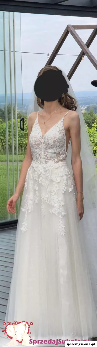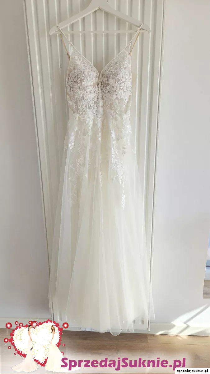 Sprzedam piękną, romantyczną suknię ślubną model D2840 marki Essence of Australia. Fason A-linia, delikatna koronka i tiul, bardzo kobieca i lekka. Suknia bez trenu – wygodna do tańca i poruszania się.