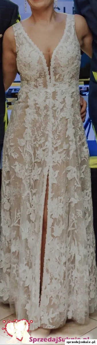 Suknia w stanie idealnym, została uszyta na miarę, rozm. 40 (zainteresowanym podam dokładne wymiary) na wzrost 166 cm + 6 cm obcas. Za suknie w salonie zapłaciłam 4250 zł (posiadam dowód zakupu).