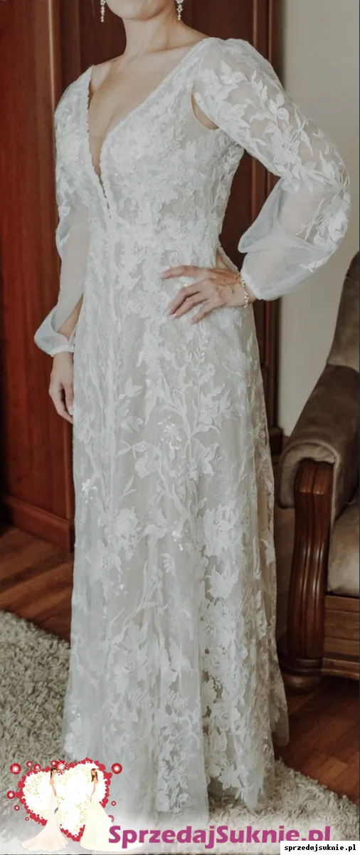Sprzedam suknię ślubną model Lazarmi, fason litera A zakupioną w salonie Cymbeline, z kolekcji 2020. Piękna z długimi bufiastymi rękawami (odpinanymi zatrzaskami), z delikatnej romantycznej koronki. Gorset z głębokim dekoltem podkreślonym koronkową taśmą (posiada wszyte miseczki). Tył sukienki posiada głęboki dekolt wycięty w literę V. Suknia posiada rozcięcie z przodu zakończone delikatnym trenem.
