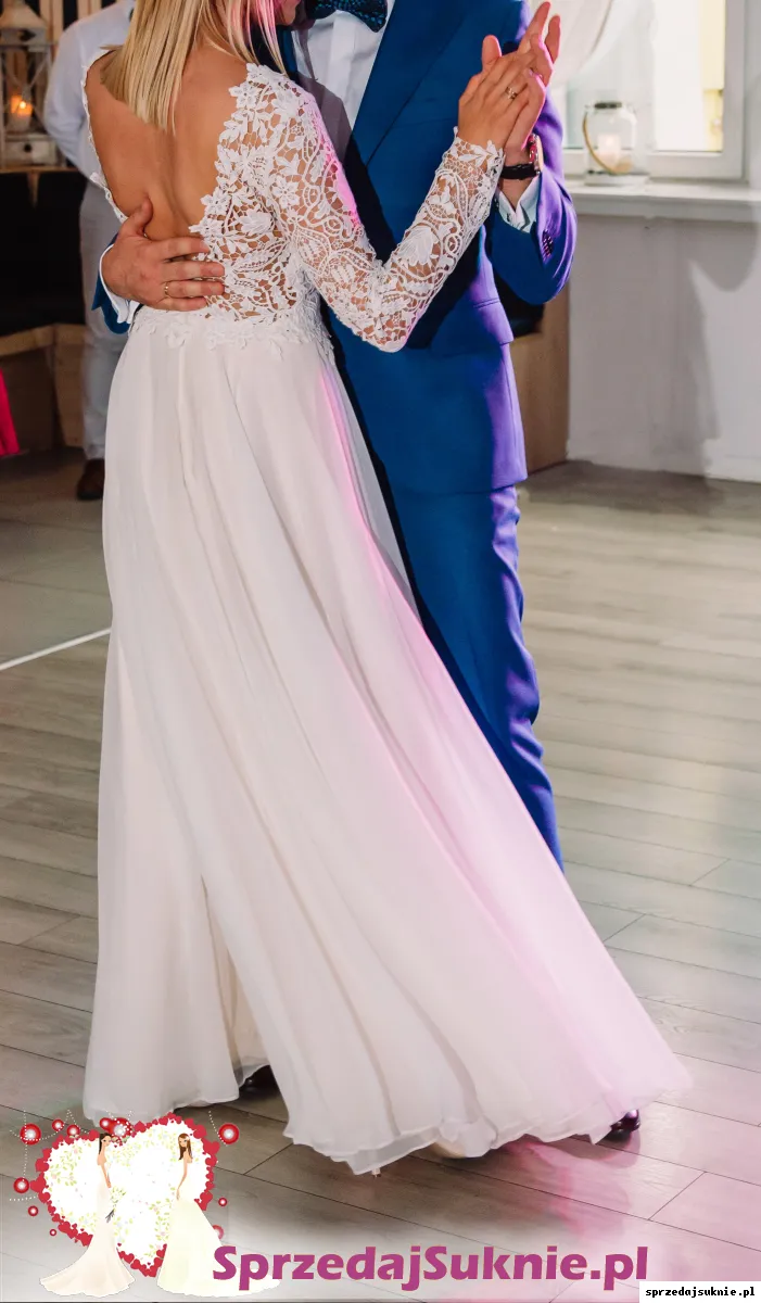 Ma długi rękaw, zabudowany dekolt i piękne wycięcie na plecach w literę V które je wysmukla. Dół to prosta, lejąca się spódnica z długim rozcięciem na nodze