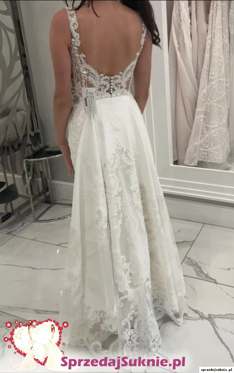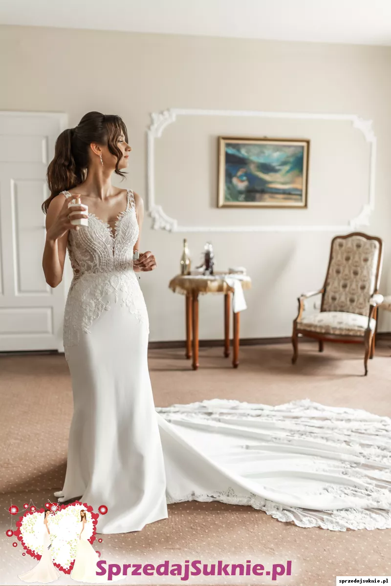 Suknia posiada piękny, długi tren, ozdobiony koronką, który można podpiąć na guziki. Po podpięciu bardzo ładnie układa się w tańcu.