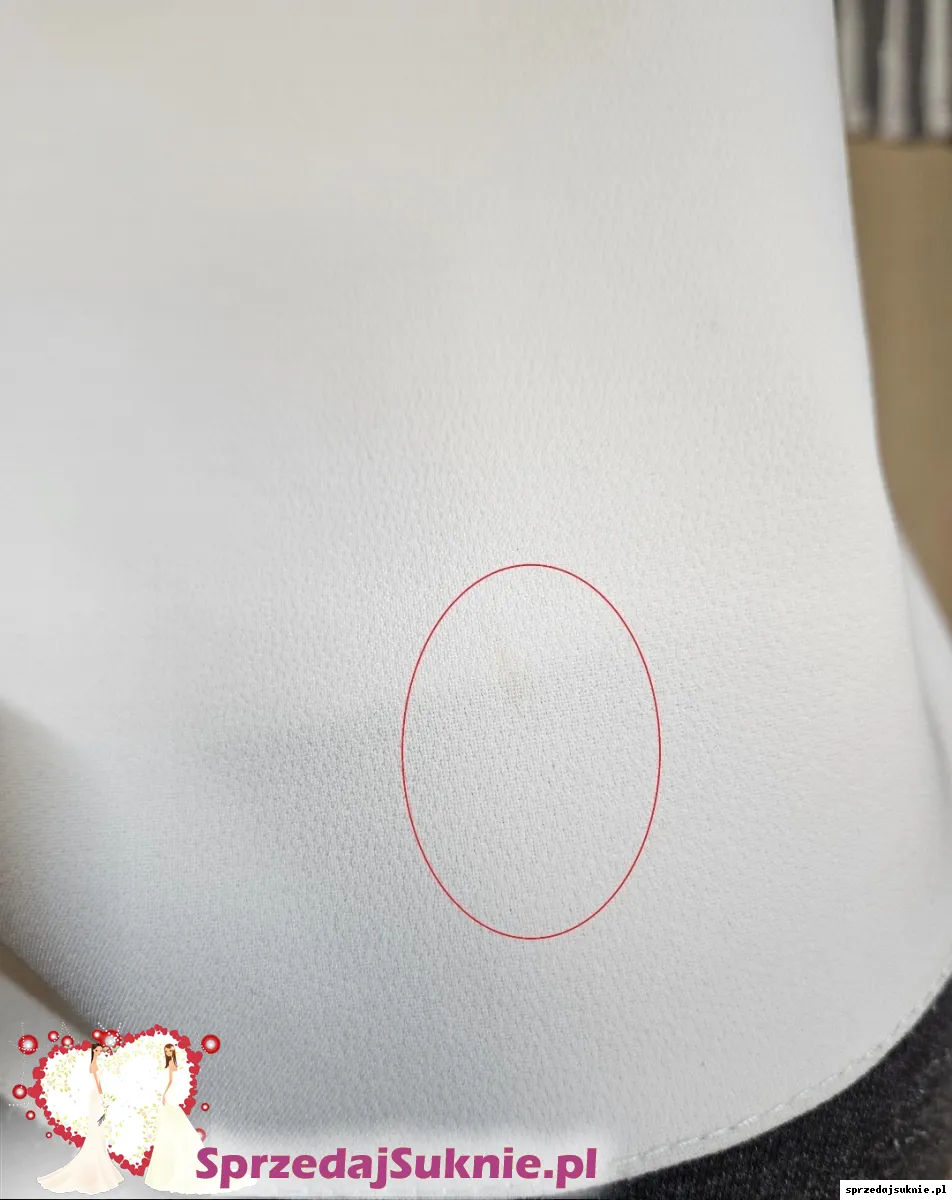 Suknia jest wyprana chemicznie, nie ma żadnych rozdarć ani uszkodzeń, poza delikatnym śladami użytkowania w postaci zabrudzeń na samym dole sukni, które nie rzucają się w oczy - zaznaczone czerwonym okręgiem.