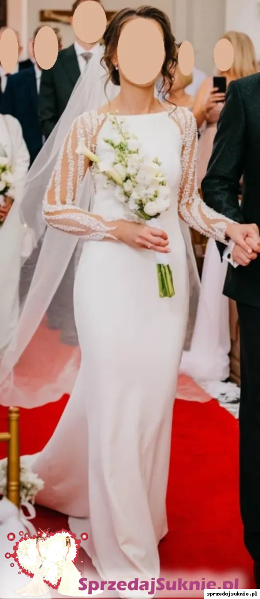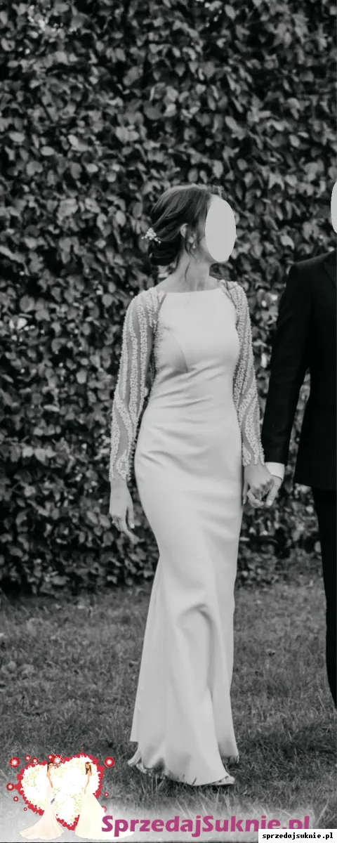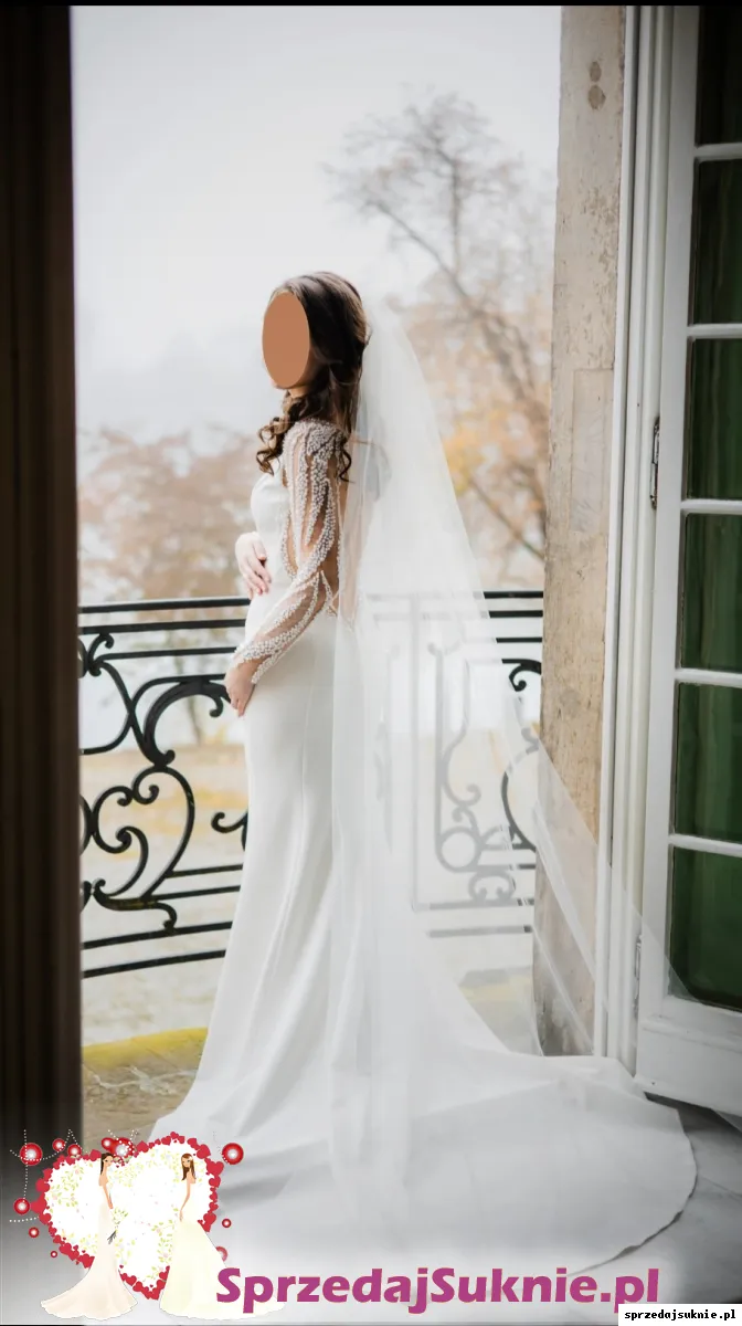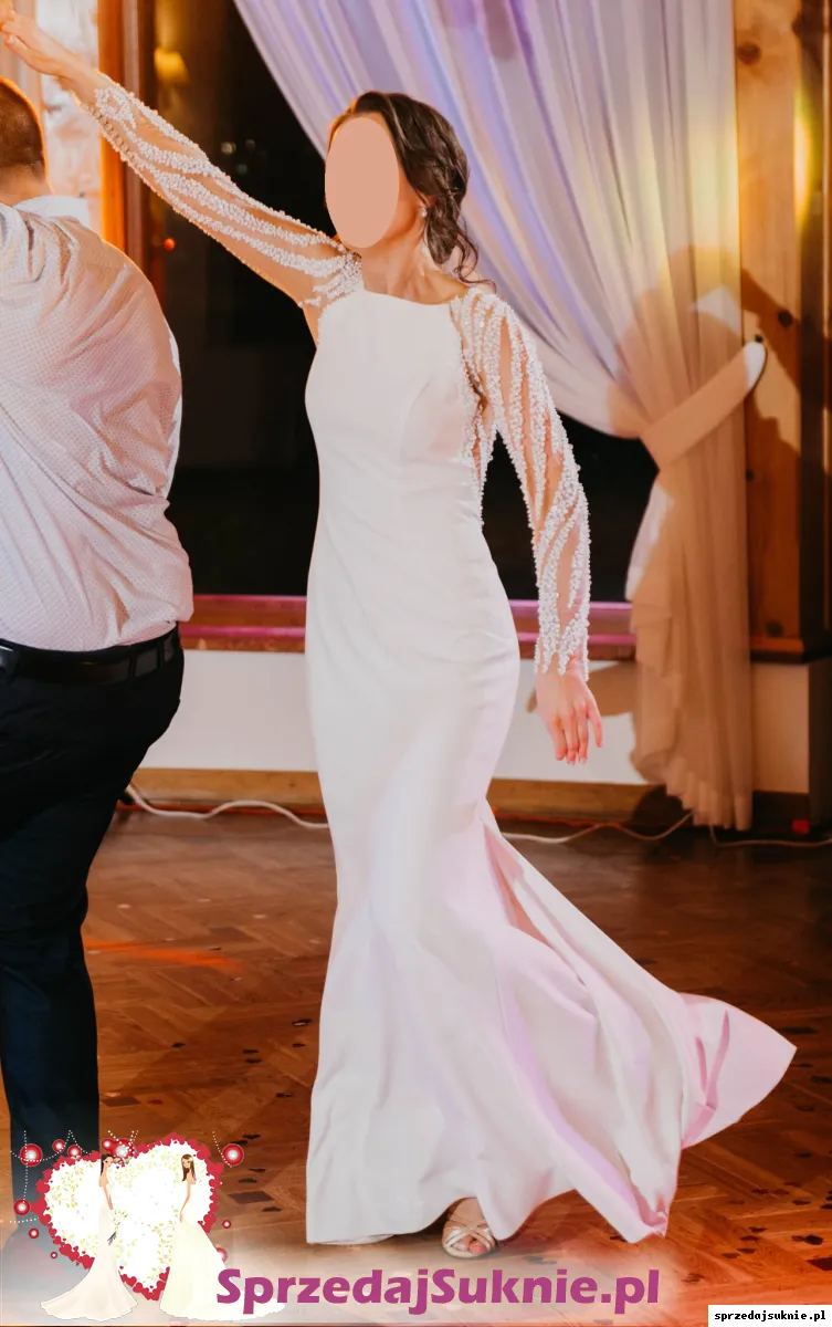 Gładka, klasyczna suknia ślubna o kroju rybki/syrenki w kolorze ivory, zapinana na guziczki i krótki kryty suwak. Plecy i rękawy uszyte z siateczkowego, przezroczystego materiału, wyszywane perełkami i koralikami układającymi się w efektowny haft.